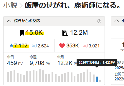 →ありがとうございます。完結済みなので増えたり減ったりですが、ここまで到達。感慨無量です。