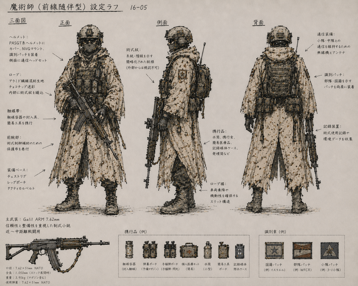 拙作の魔術師は現代の装備に、アナログなローブをまとう。魔術師と言えばローブ。アラミド繊維に内側に文様を縫い込んでおり、魔術の発動補助、魔術発動に魔力が揺らぎ魔獣に気が付かれやすくなる。これをわずかながら吸収し、目立たなくする効果がある。としている。厚ければより効果的だが、中東戦線では熱中症で死にかねない。難儀である。