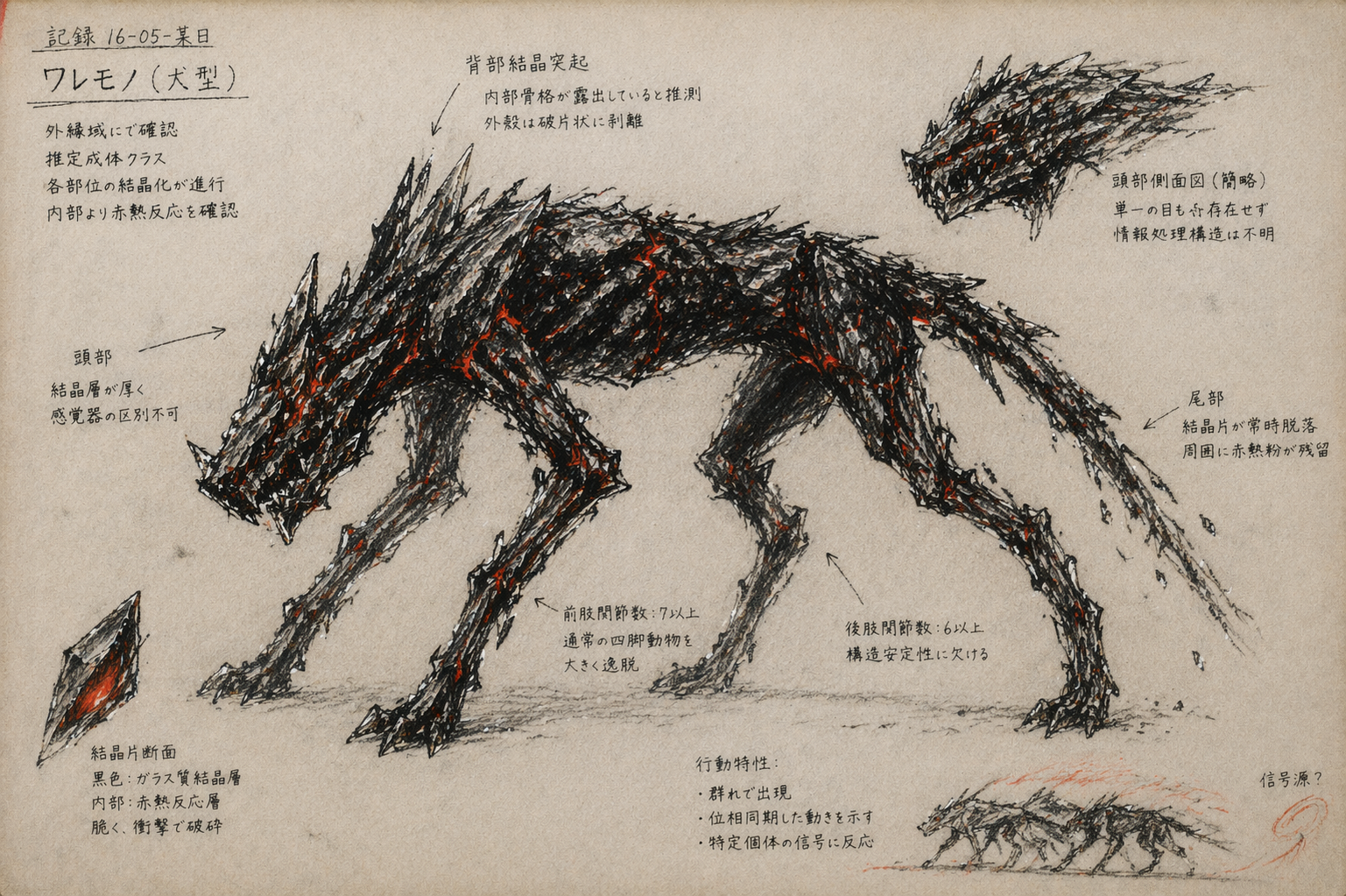 結晶質に変質していくものの、ガラスのように割れそうなくせに硬い。とにかくしつこい。現代兵装で獣ごときに追い込まれるなら、ある程度の防御と、機甲戦力をつぶせる何かが必要だ。