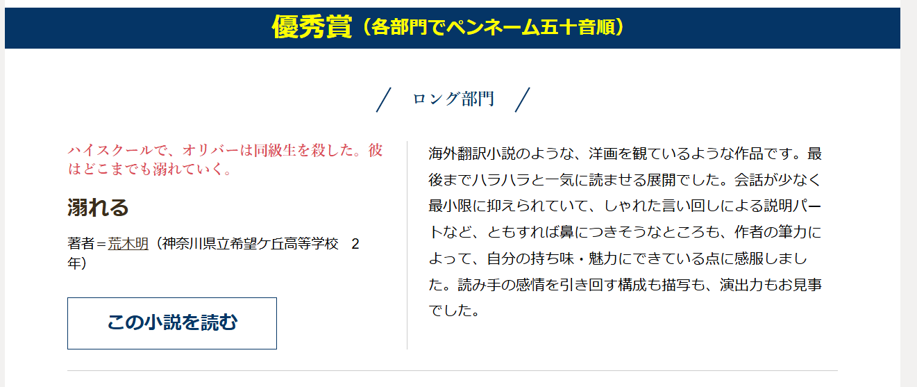 私は去年、五作品を応募しそのうちの一作「光台高等学校文芸部」が中間選考突破、最終選考落選という形で終わりました。