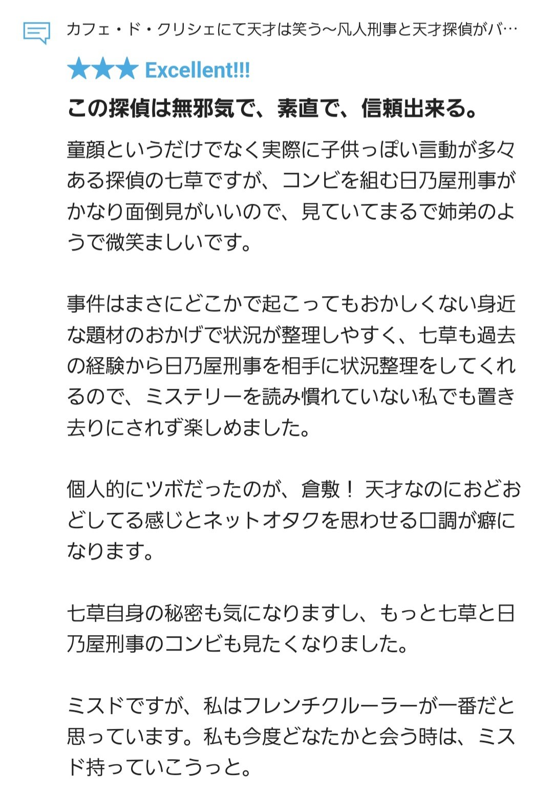 ↓のリンクはレビューを貰った作品、「カフェ・ド・クリシェにて天才は笑う~凡人刑事と天才探偵がバディを組んで難事件に挑む!~」です。