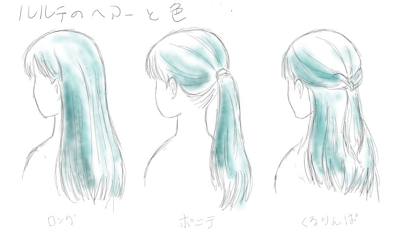 ルルテの髪の色(メノウ色)と髪型についてご質問があったので、近況ノートで、ルルテの髪の毛の色と形の設定資料をご紹介します。