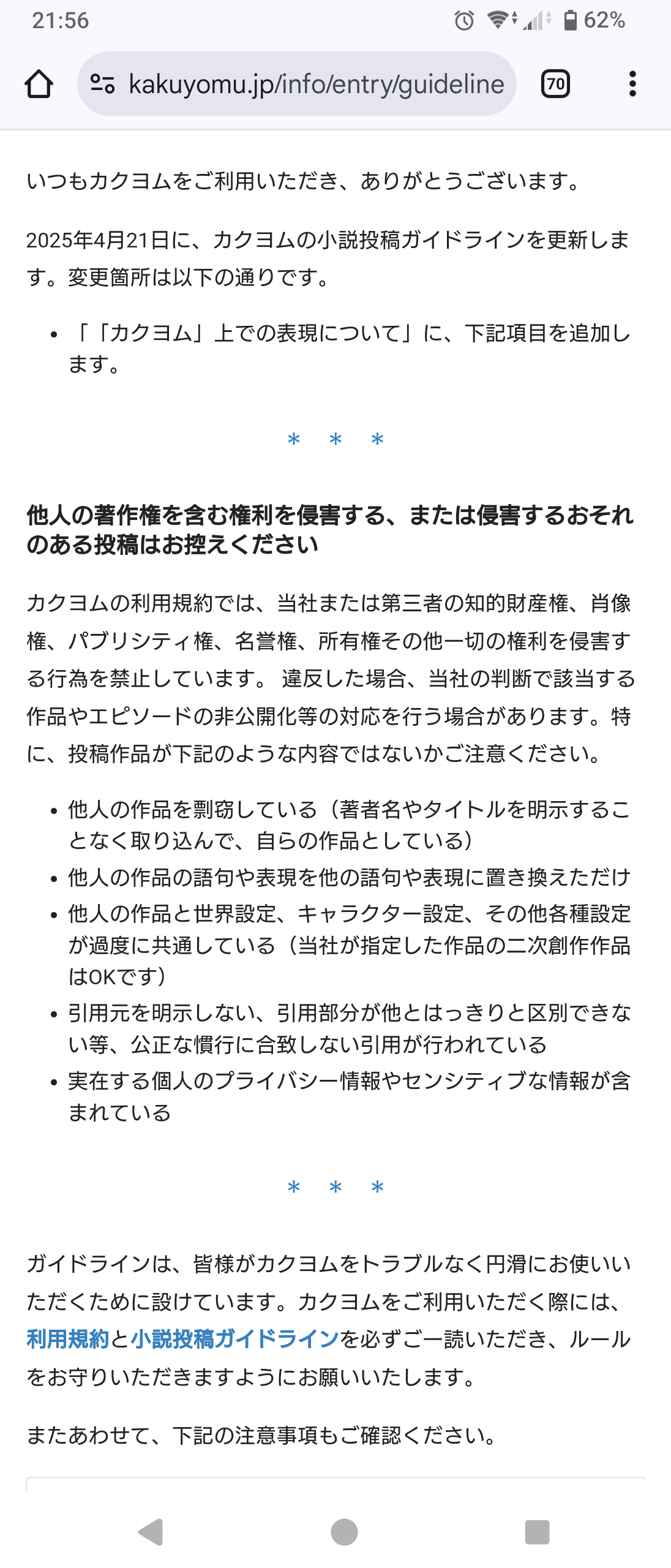 カクヨムでの更新をやめようかなと思っています。理由は画像に添付してあるカクヨムの方針変更です。自由にものを書いていても、自分の場合は著作権に違反するのかなと思いまして、恐らくは非公開措置が取られると考えたからです。