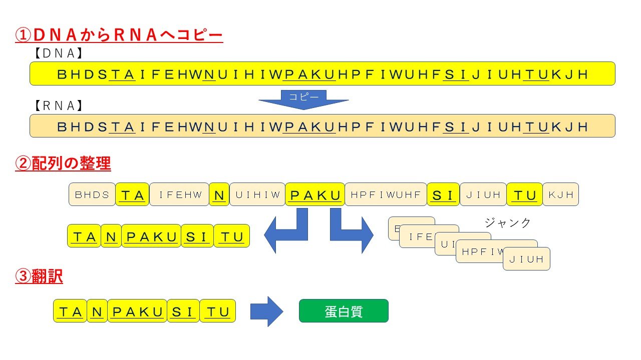 9話目ですが、私の勉強不足と説明下手で「遺伝子」の役割がなんのことやら判らなかったかもしれませんので、解説図を添付してみました。