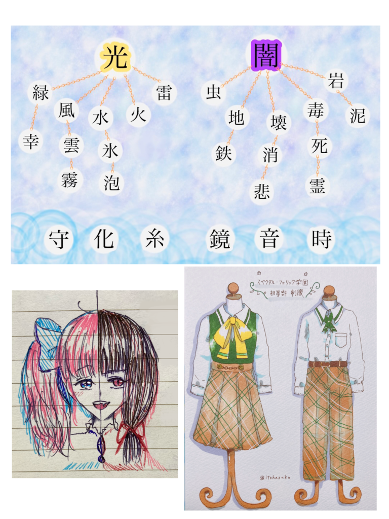 今回の画像は、エレンのヴァンパイアの姿と、エレンが通うスぺクタル・フェリック学園の初等部(小学校)の制服、光術と闇術の派生について分かりやすくまとめた図です。