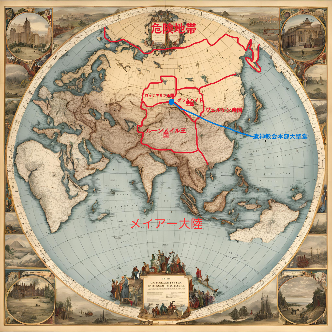 前にノートに載せたメイアー大陸地図に危険地帯の位置と、遺神教会の本部である大聖堂がある場所を加えたものを載せます。