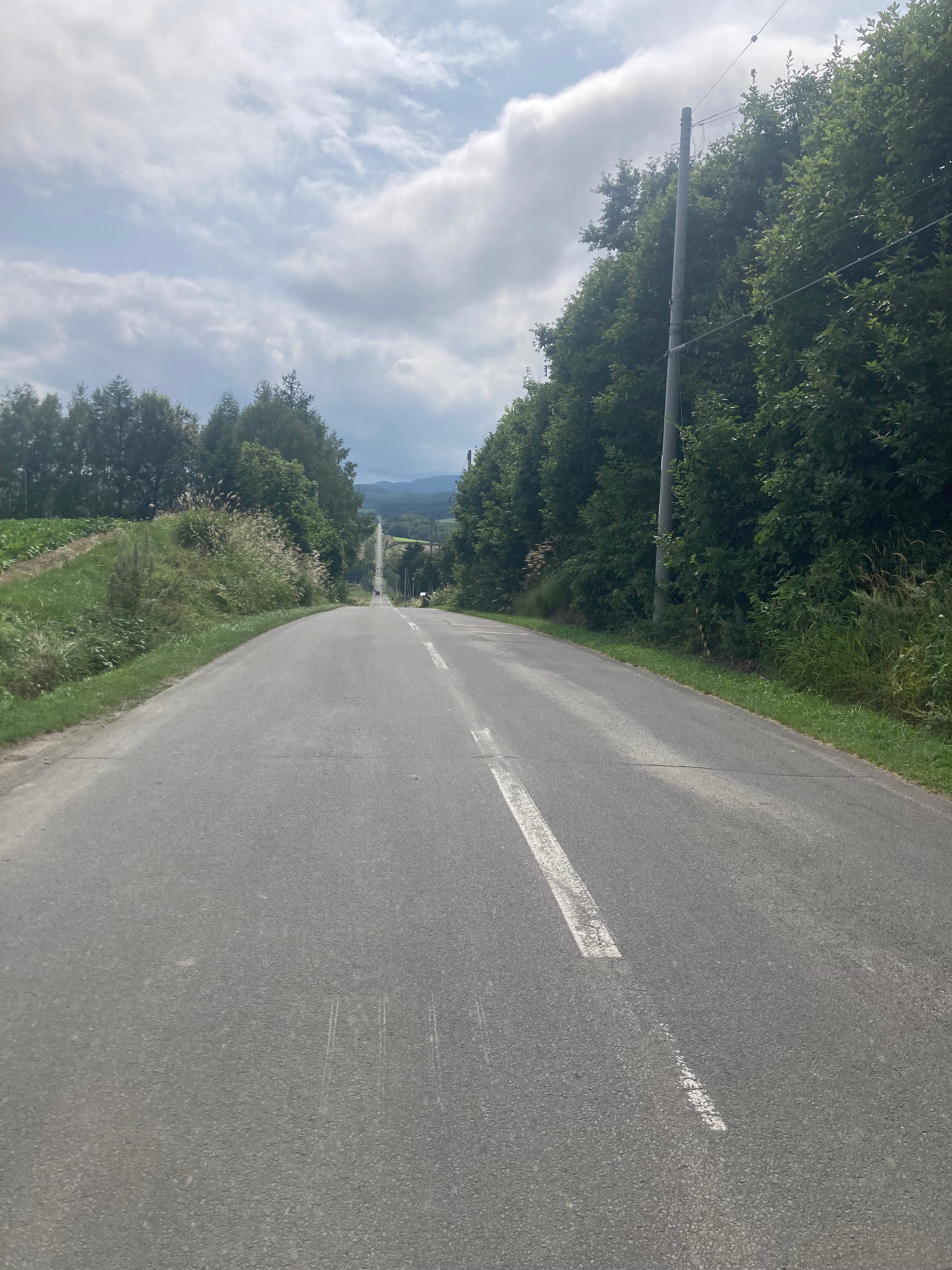 ちょっと見にくいかもですが、上富良野町にある、通称「ジェットコースターの路(みち)」。丘の向こうまで、ずーっと一本道。もちろん信号機なんかありません。