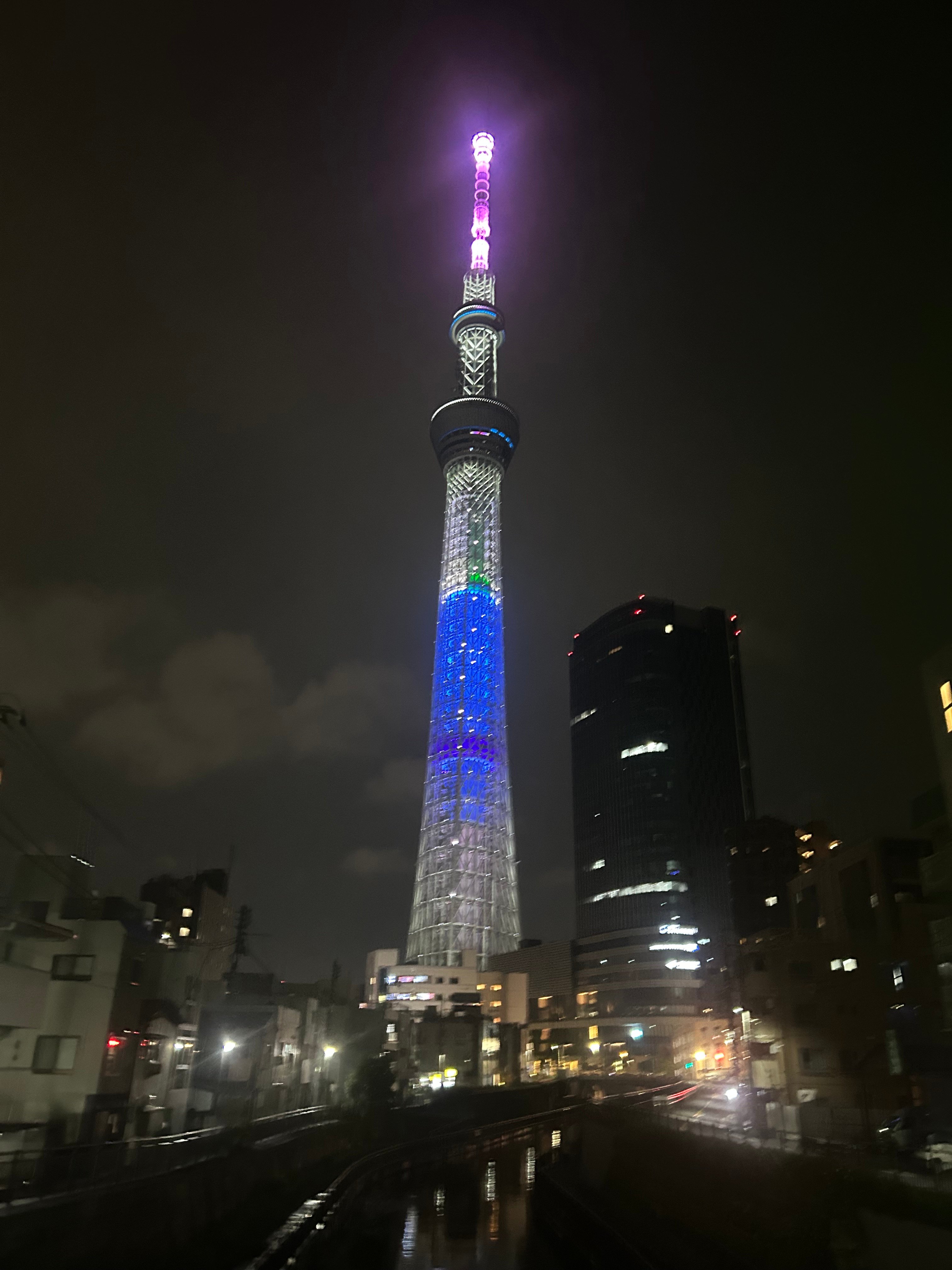 仕事柄、夜型で、夜好きなんで。ちなみに、昨日、一昨日はトランプ大統領が来たから、スカイツリーが星条旗色(青、赤、白)になってました。