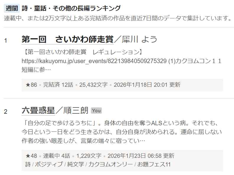 『六畳惑星』が週間詩・童話・その他の長編ランキングで2位になっていました。 (月間ランキングでは8位)
