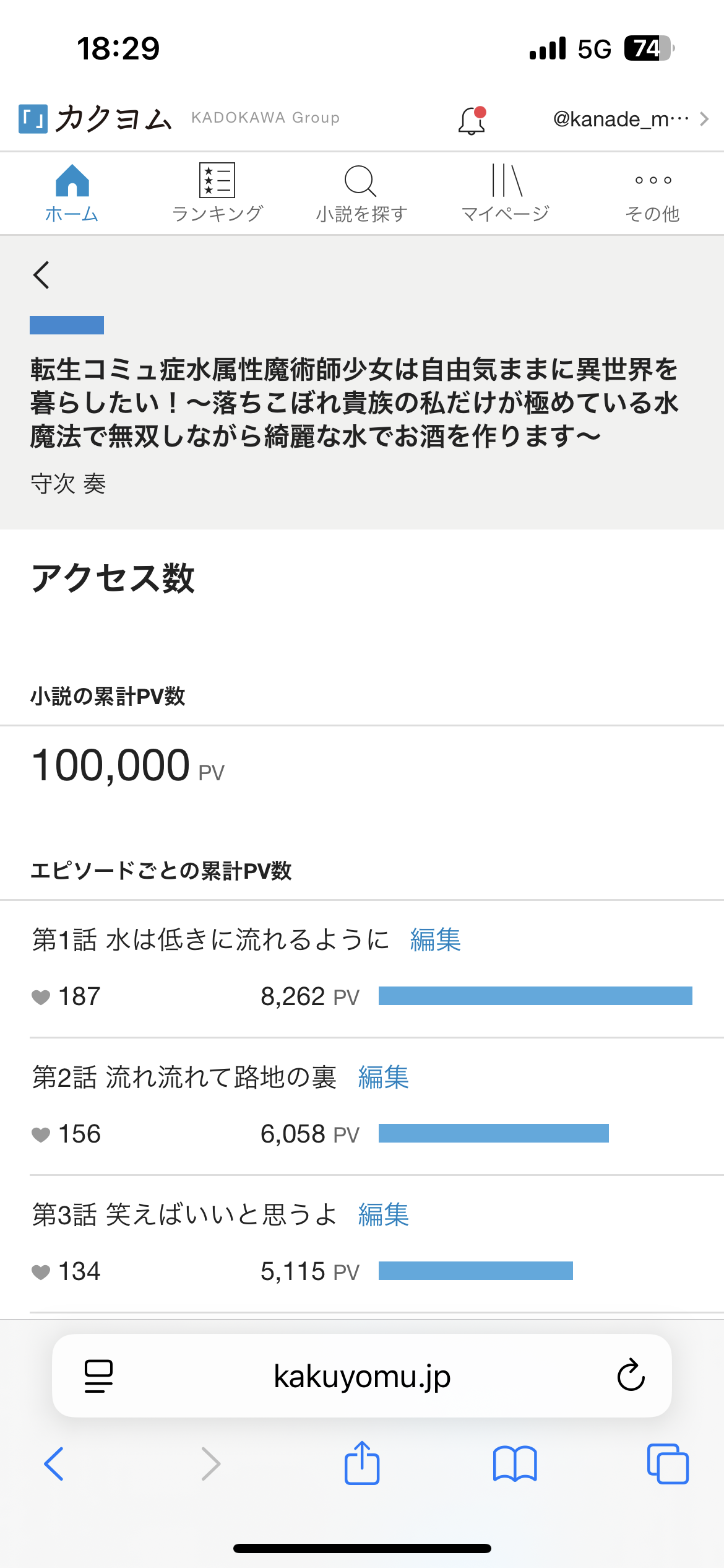 現在鋭意執筆中である「転生コミュ症水属性魔術師少女は自由気ままに異世界を暮らしたい!〜落ちこぼれ貴族の私だけが極めている水魔法で無双しながら綺麗な水でお酒を作ります〜」が、カクヨム公式さんに女性異世界部門のランキングで取り上げていただいたおかげか、累計10万PV達成しました!