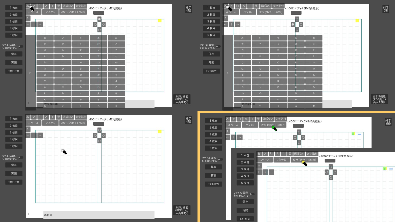 これは、マウスの左ボタン(或いは、その入力を割り当てた何かデバイスの1ボタン)の押下だけによって、文字列を記入していくことを想定し、かたちにしてみたものです。
