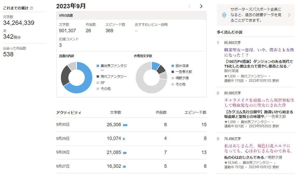 9月は集中して読んだ作品がなかったので割と低調でした。
