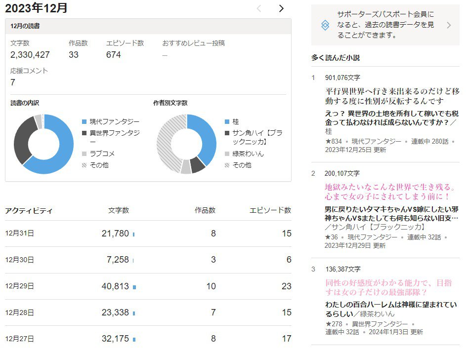 12月は2.3M文字読んでいたようです。やっぱりまとめ読みをすると一気に伸びますね、相変わらずTS物ばっかですが。