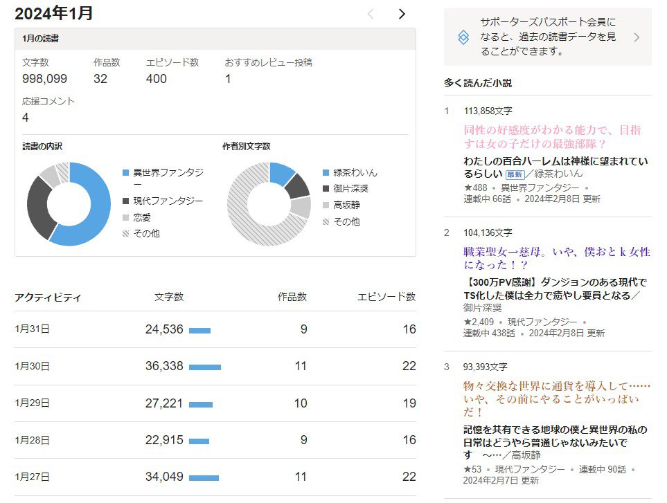 1月は低調でした。前半は色々とやることが多くあって、後半はなんか気が抜けていて、結果99万8千文字という中途半端な結果。
