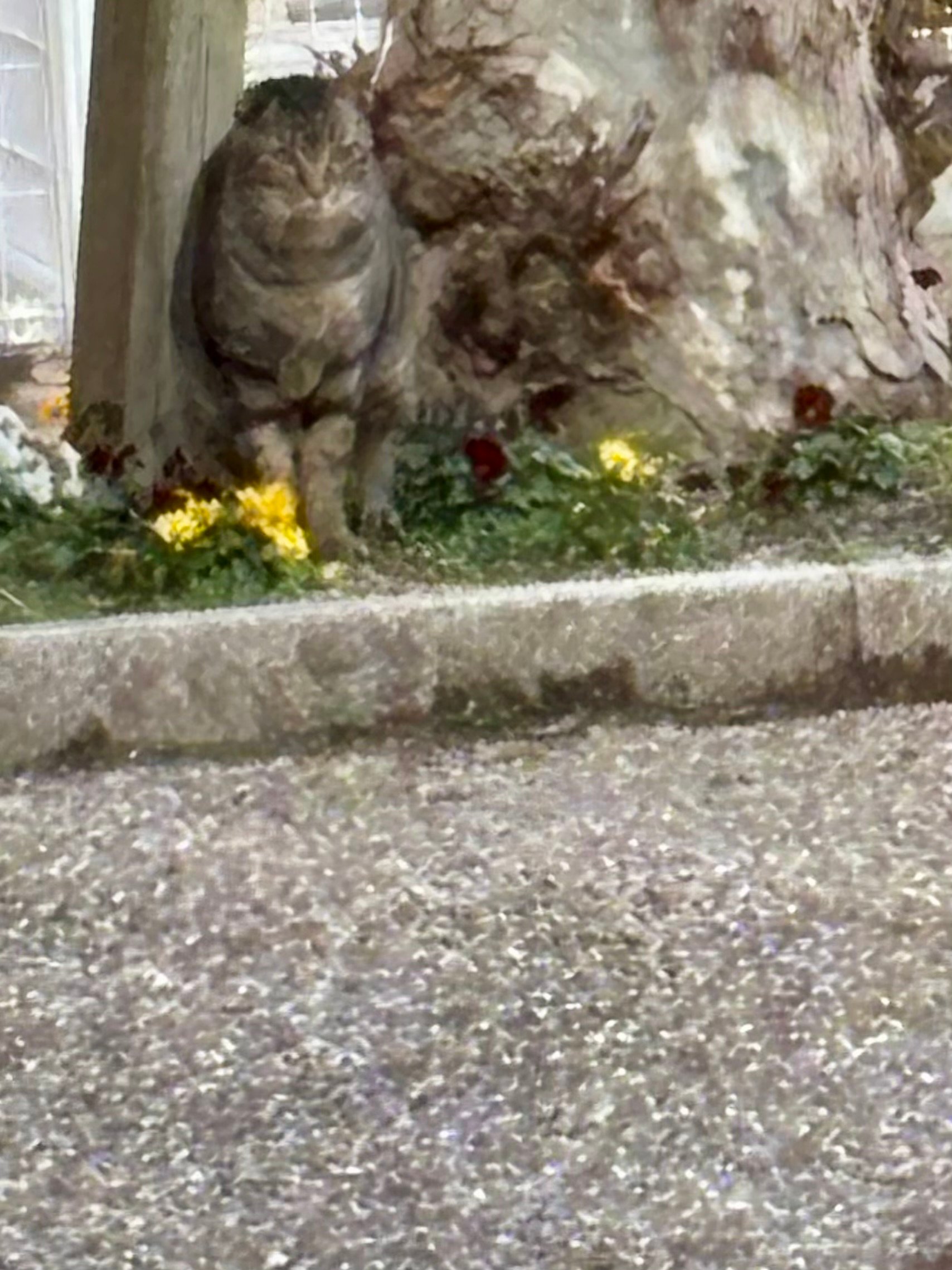 写真はテントウムシと同じ日に撮ったノラネコ。急いで撮ったんでピントがボケボケなんですが。木と一体化してる。