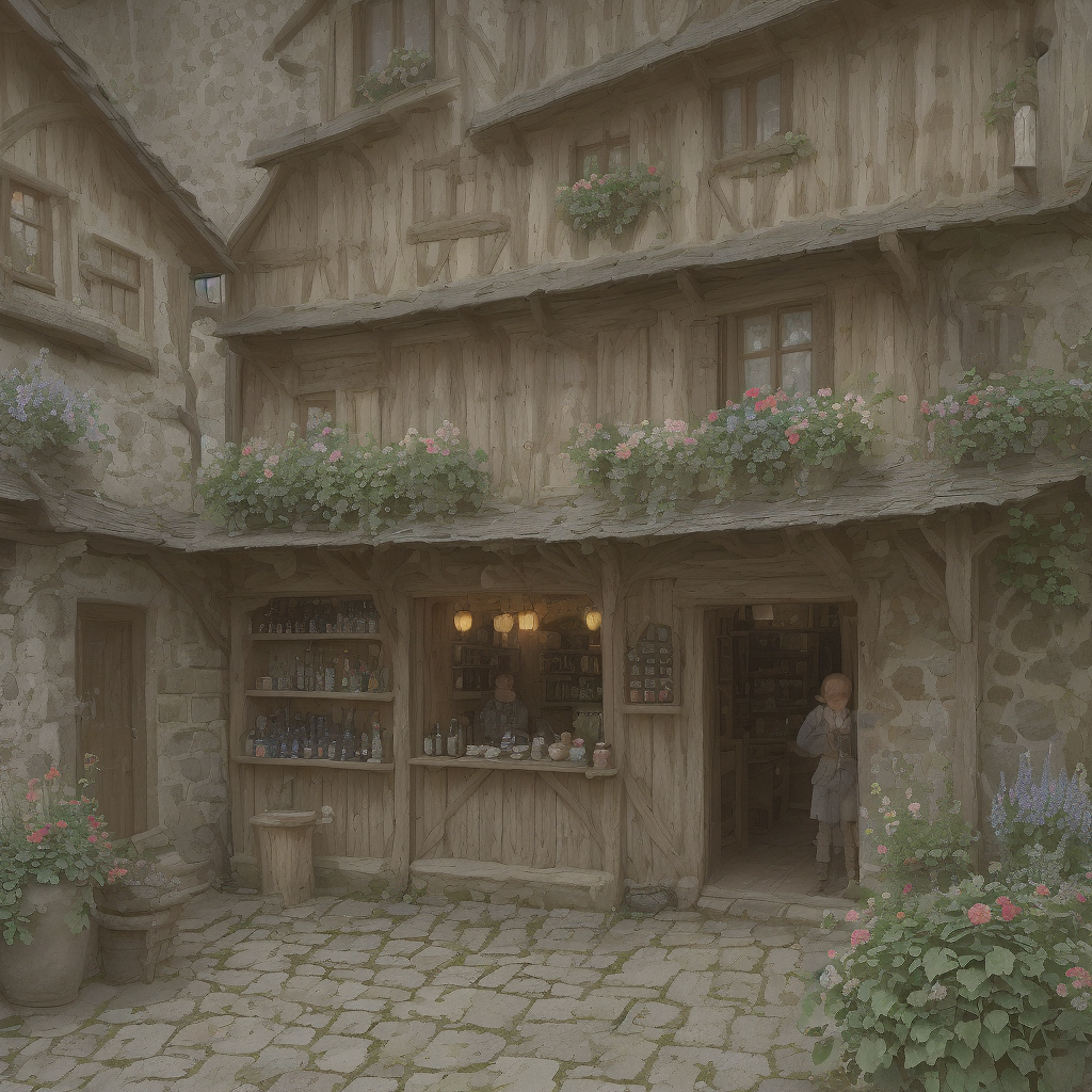 AI画像。異世界転生後の田舎の小店舗。挿絵に使います。