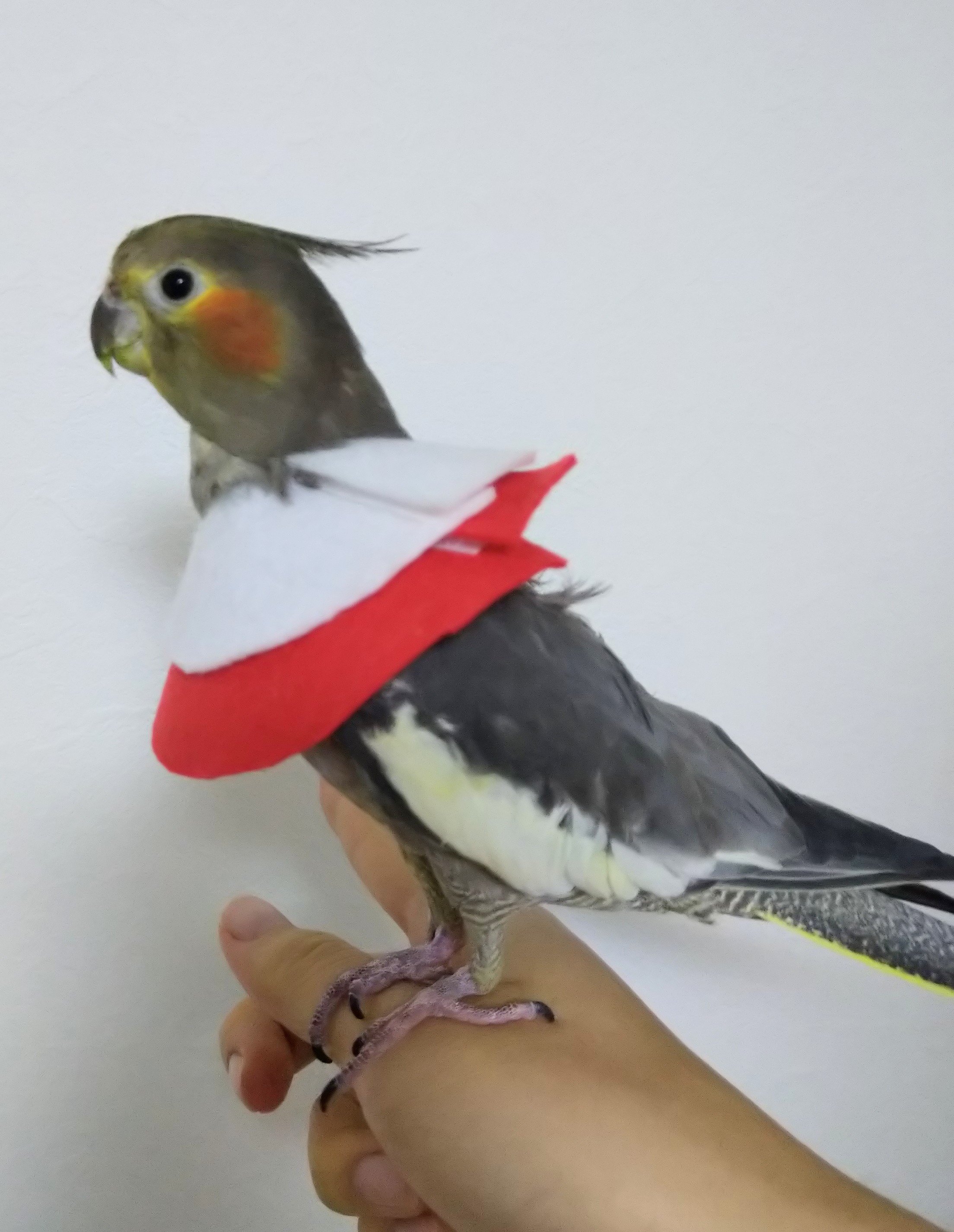 写真は、お正月なので紅白カラー装着のオカメさんです。