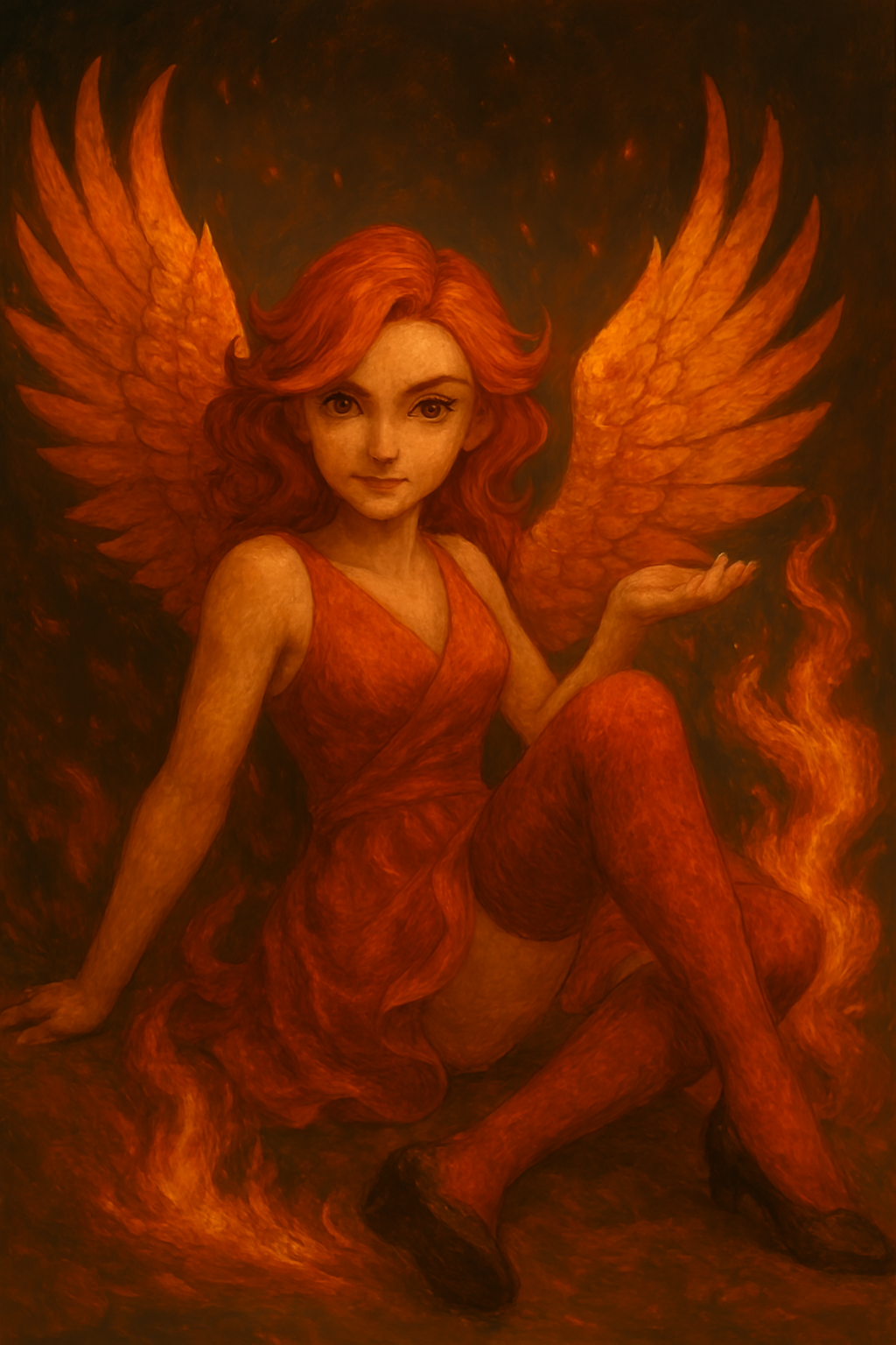 最後に、描きかけのイラストも完成できそうにないので、最近AIさんに作ってもらった炎の精霊フィネーレちゃんのイメージを載せておきます。