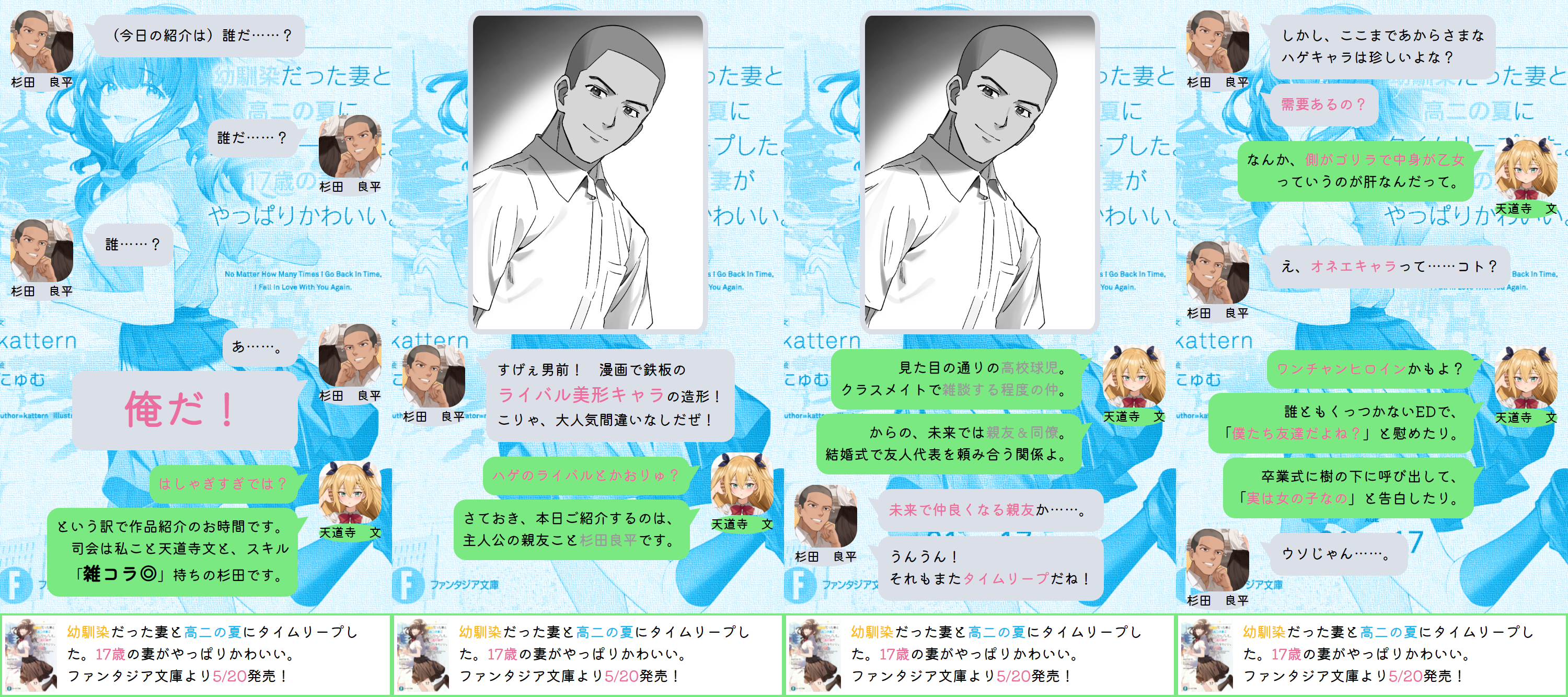 「幼馴染だった妻と高二の夏にタイムリープした。17歳の妻がやっぱりかわいい。」のトークアプリ風宣伝(その6)です。