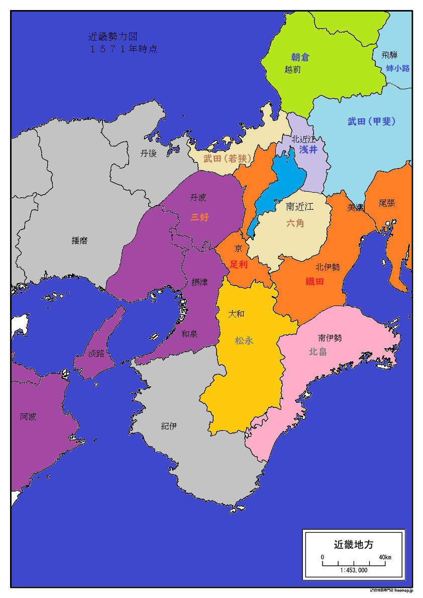 タイトルの通りなのですが状況を分かりやすく説明するために現在、第83話段階での近畿の勢力図をざっと書いてみました。現代の地域別都道府県の白地図に線引き・色分けで書いてあるだけの物なので戦国時代の国分けに沿っていない部分はありますがご容赦ください。