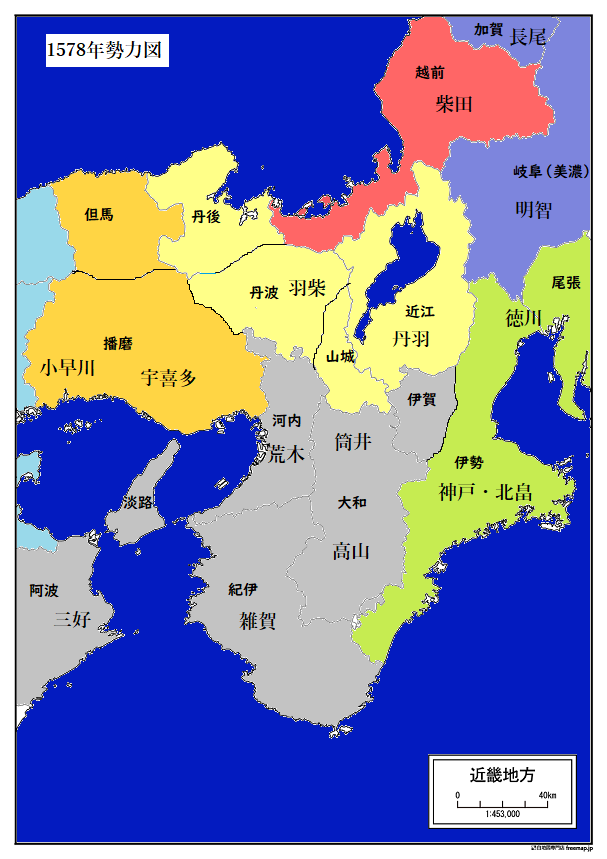 史実の1582年では信長の毛利征伐が始まっており、秀吉は前線の備中(現在の岡山県)に、光秀は京都周辺に居たのですが、寿司天ワールドではその4年前の段階で事件が起こっているので、秀吉はまだ播磨あたりで毛利とガッツリ戦ってはいない状況です。