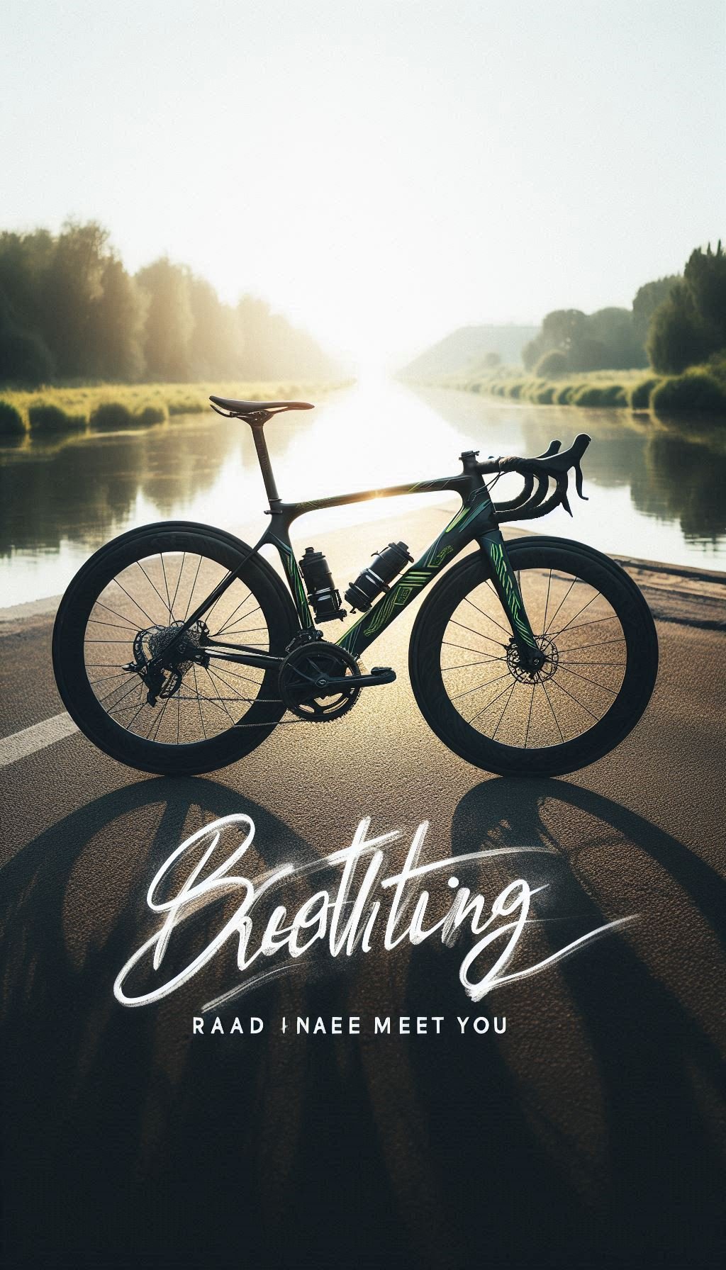 「川沿いのアスファルトの道路に止まる1台のロードバイク、上から降り注ぐ光、書き殴ったようなフォント、タイトル」で出力してみたところ……背景は超不自然だしロードバイクはコレじゃ無いヤツだし、サブタイトルは全然違う意味不明な文字の羅列になったけどとりあえず雰囲気だけは伝わった感じw