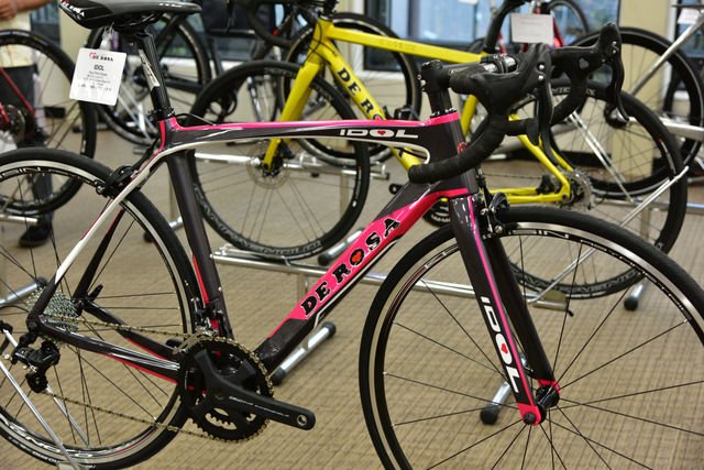 下の写真は作中で茜のニューマシンとなるDEROSAのアイドル、多分年式的に2018年あたり。黒とピンクの自転車は女子に似合うヤツですね^^ただ推奨身長160センチからなので中2段階で153センチの茜にはちょっとデカいのですがw