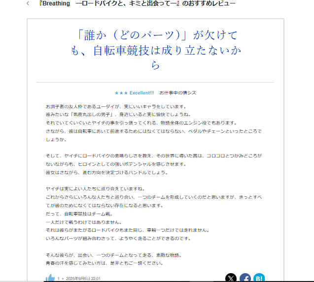 そしてそんな拙作『Breathing』にお仕事中の情シス様より素晴らしいレビューいただきました!