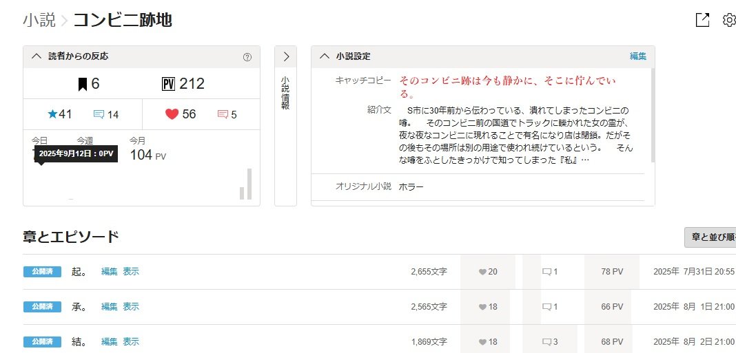 いや、何が怖いってコレかき上げたの8月アタマで、最初は相互さん読んでくれてたけど9月なんてほぼPV0が並んでて作者的にも「まあ試しで書いたホラーだから」って過去の話だと思ってたんですよ。