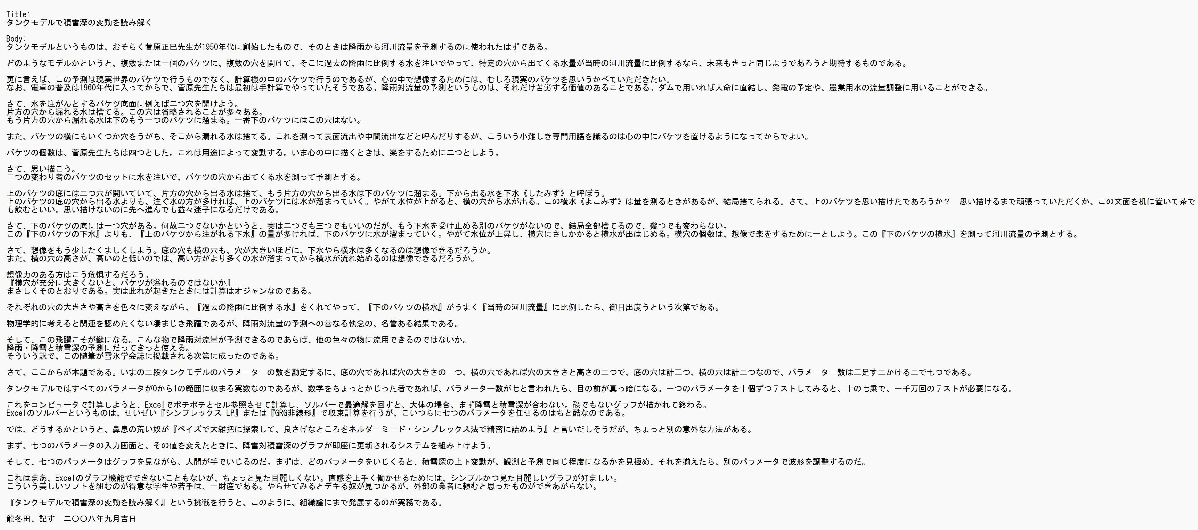 『リケジョ』で、タダシ(水球先生)の作中随筆はChapter #0020で出しました。そして、ウキ(熾炭先生)の作中随筆もChapter #0035に書いたんですよ。