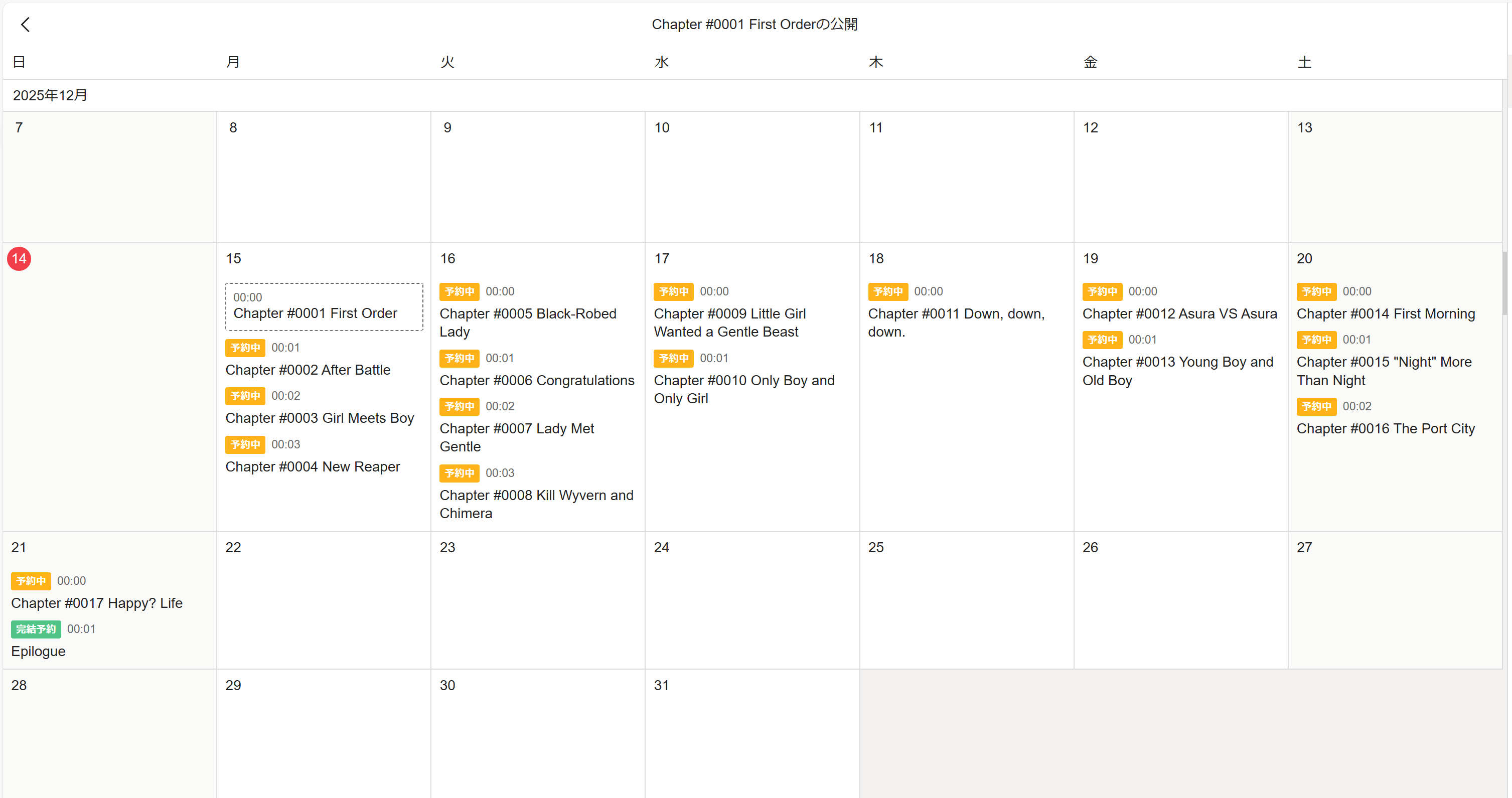 完成作品で、公開スケジュールは添付画像のとおりです。