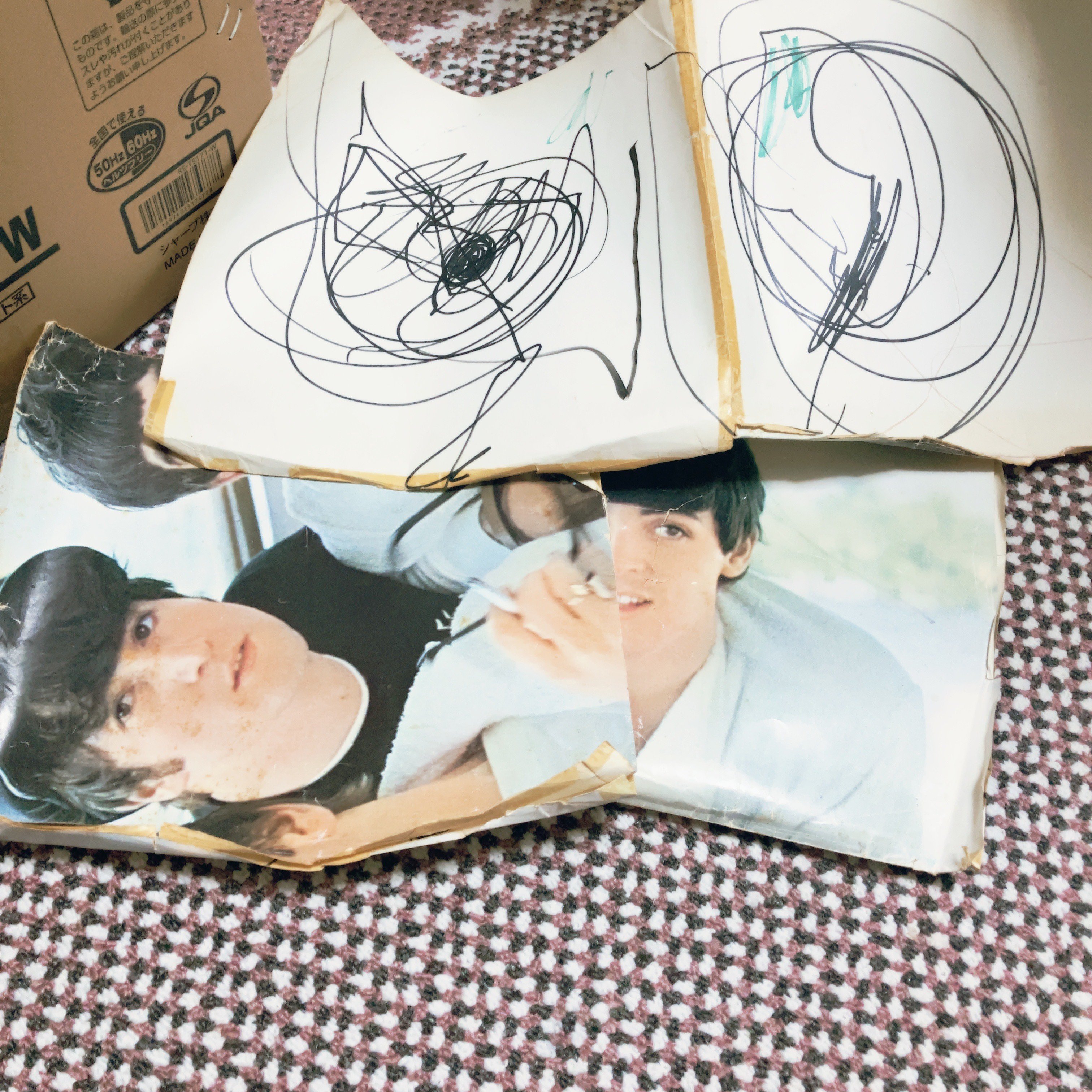 画像:秋坂ゆえ最古の手記(ビートルズ「赤盤」LPのポスターの裏面に、アグレッシブな筆跡を残しておりました。推定年齢1歳)