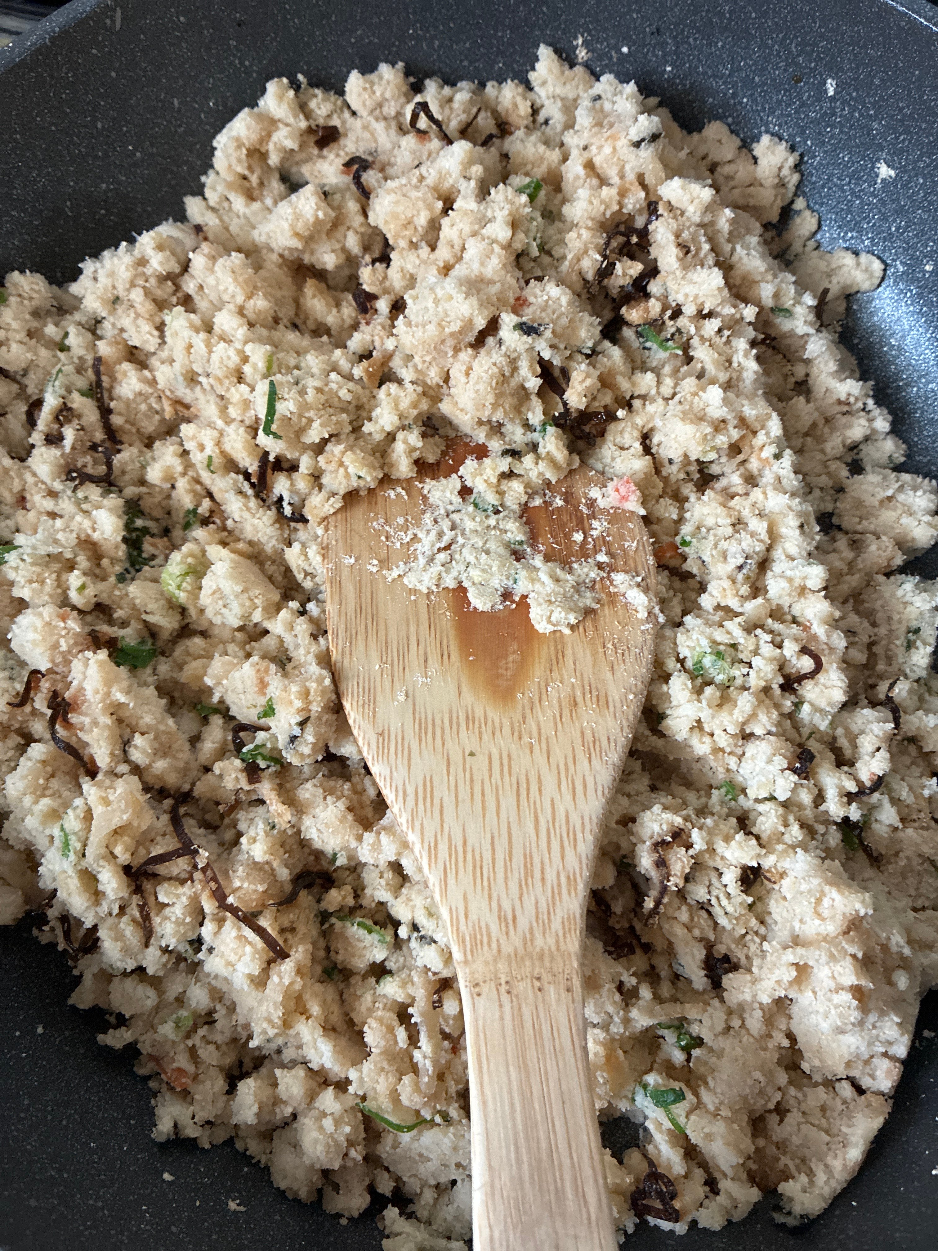 おからをフライパンに入れて、焦げ付かないようにヘラをチマチマやって卯の花を作ります。
