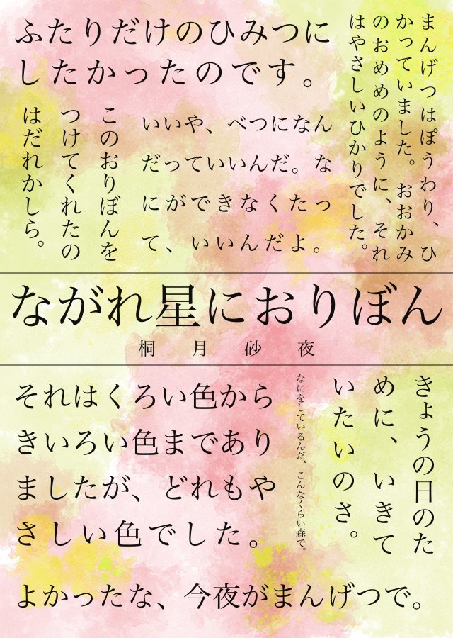 童話集のタイトルが「ながれ星におりぼん」ですから、このタイトルを元にお話を書こうと思って生まれた物語です。