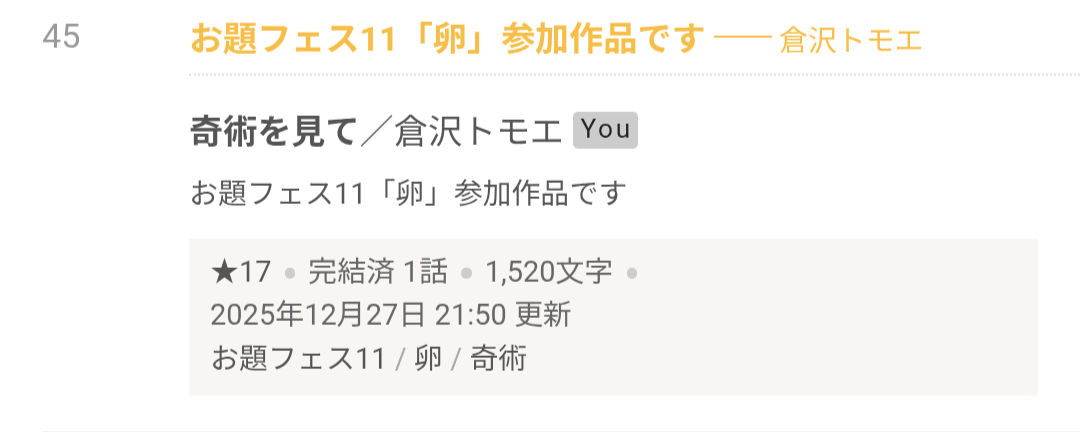 本日『奇術を見て』週間ランキング詩・童話・その他45位でした!