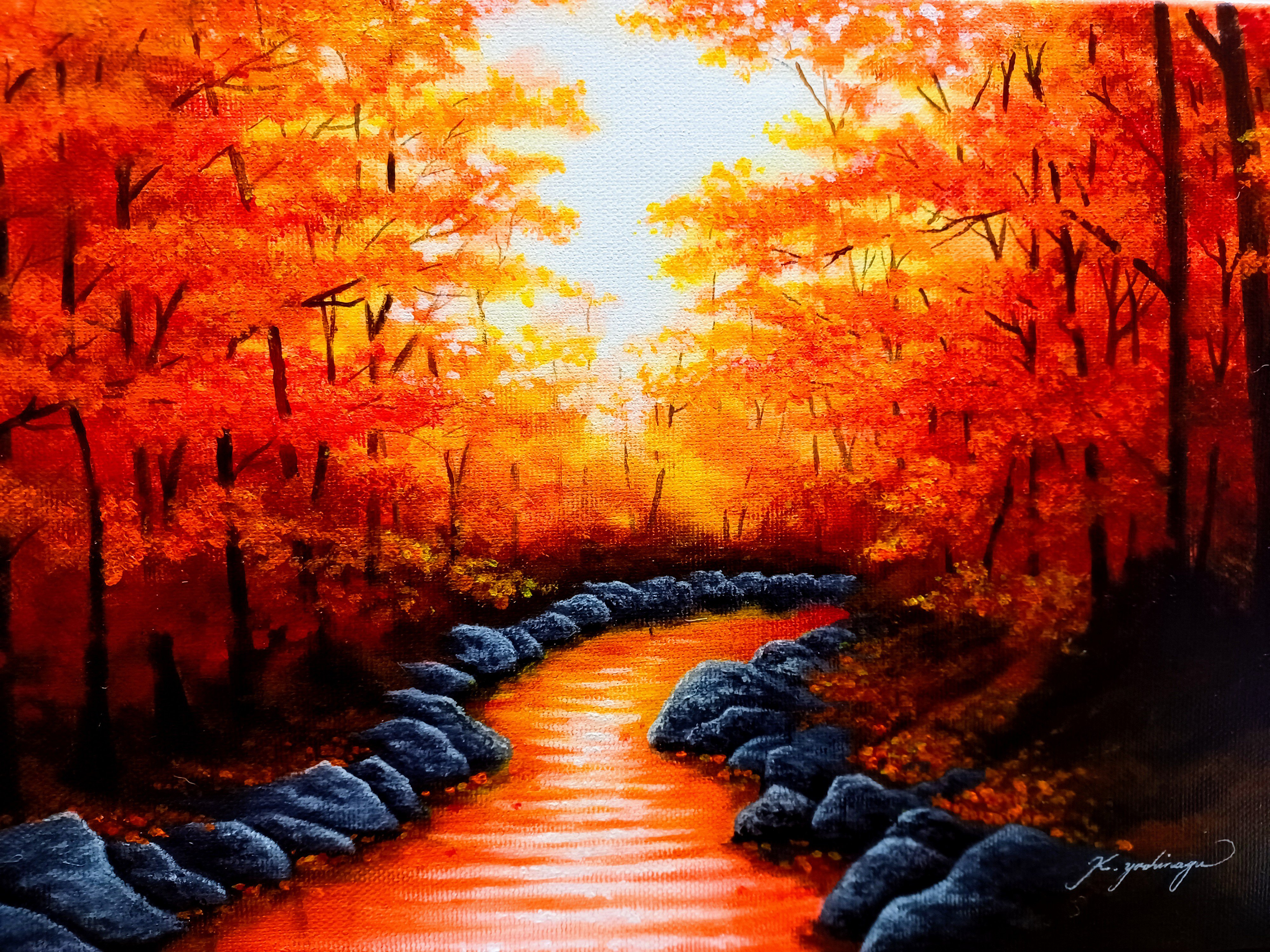 真っ赤な葉っぱが、たくさん地面に、川に、落ちている……。