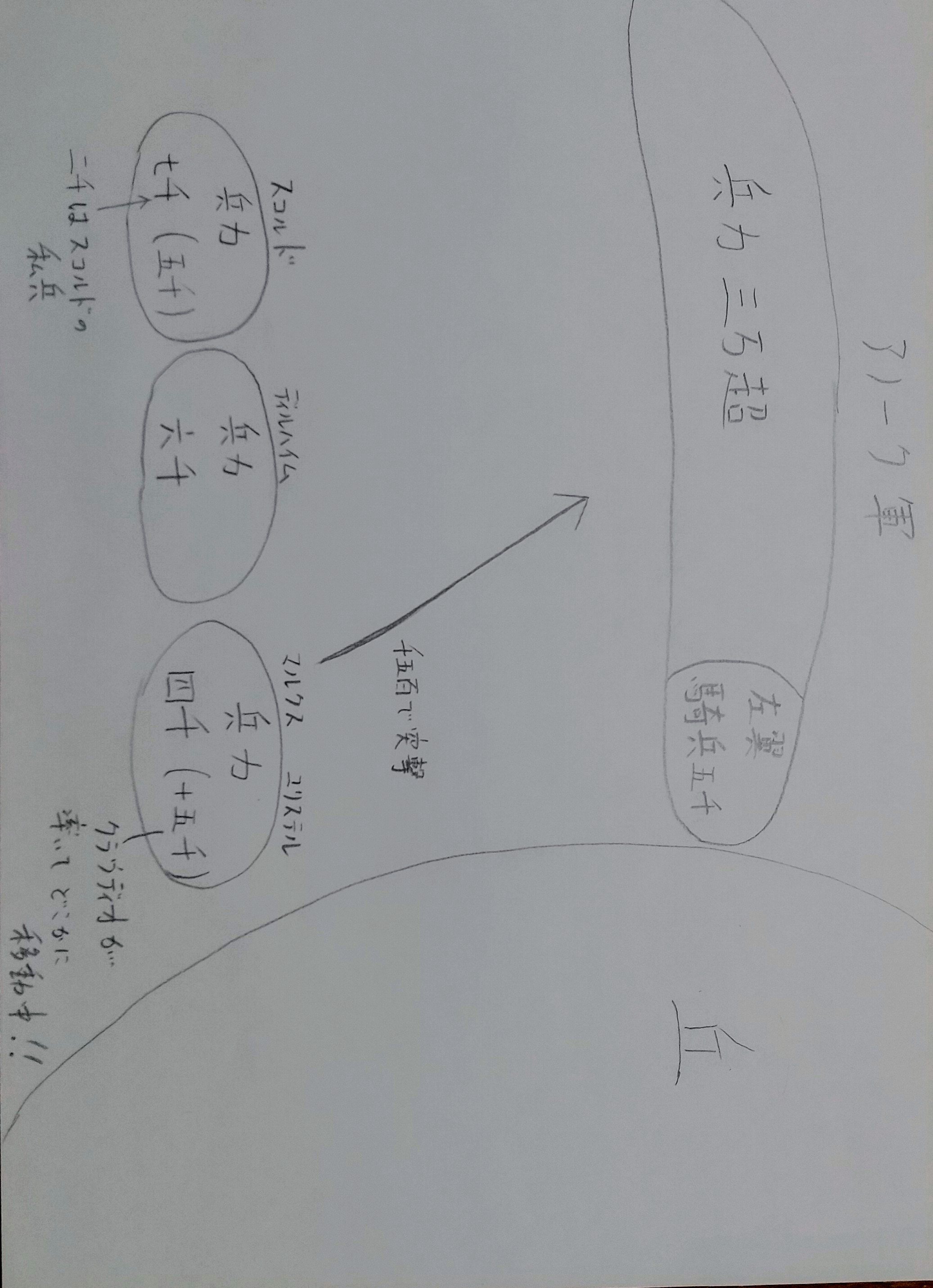 下手くその極みにいる私ですが、戦場の図を簡単(私は一生懸命)に描きました。