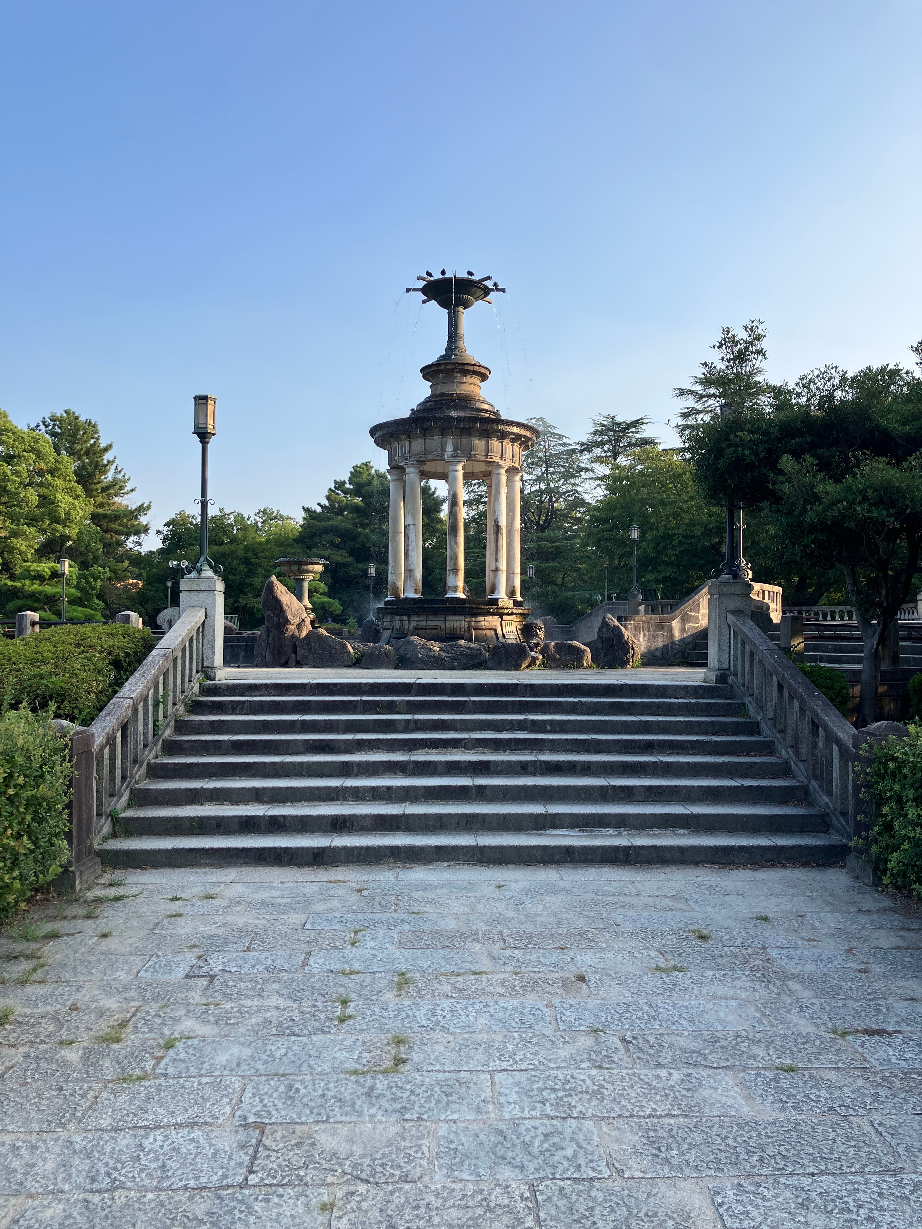 (名古屋の代表的な公園、鶴舞公園の噴水塔は、割と神々しい)