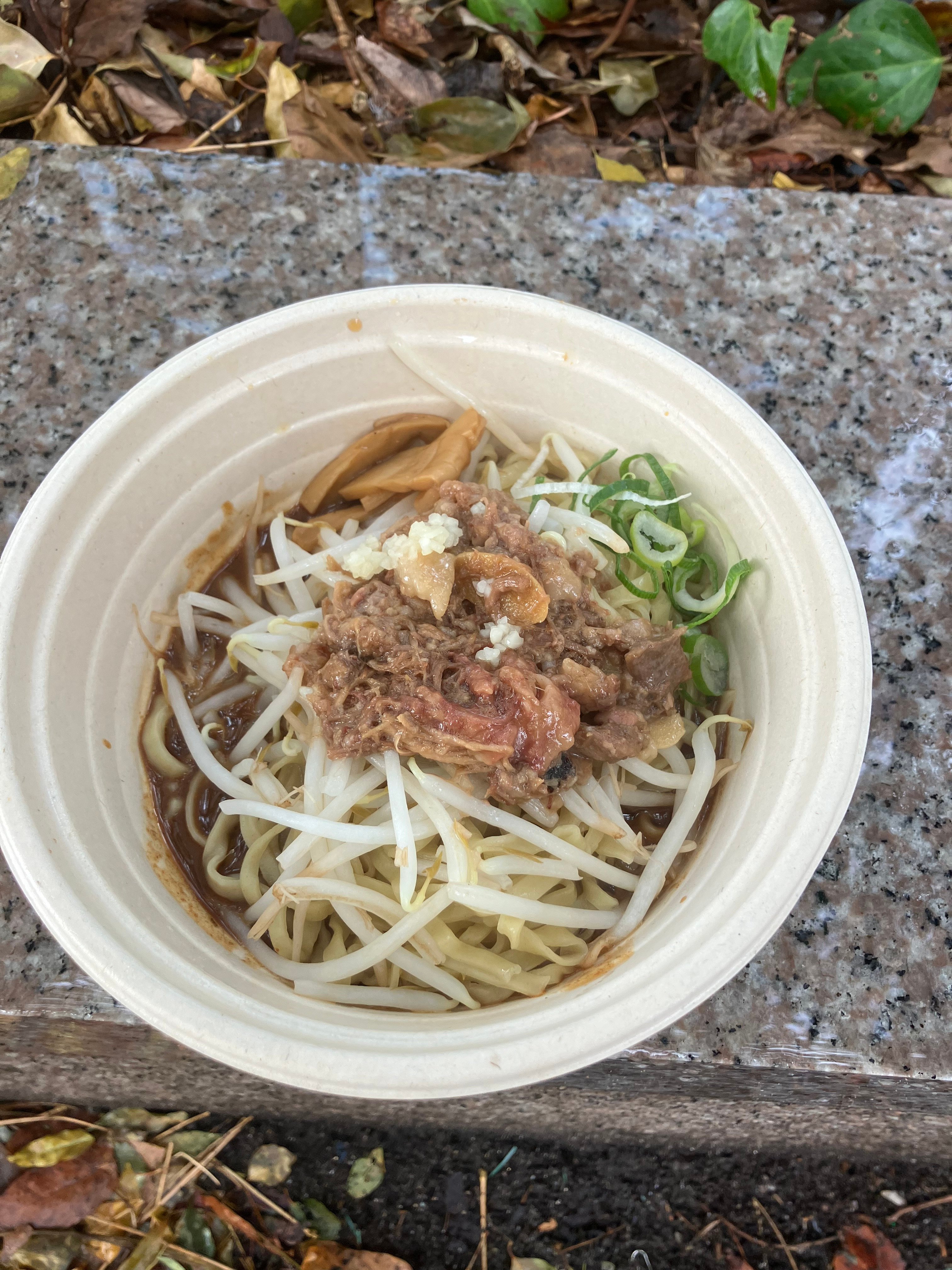 (名古屋ラーメン祭り第2弾 特濃ぶた豚黒和えそばよ。味が濃くて、水が必須よ。いってらっしゃい)