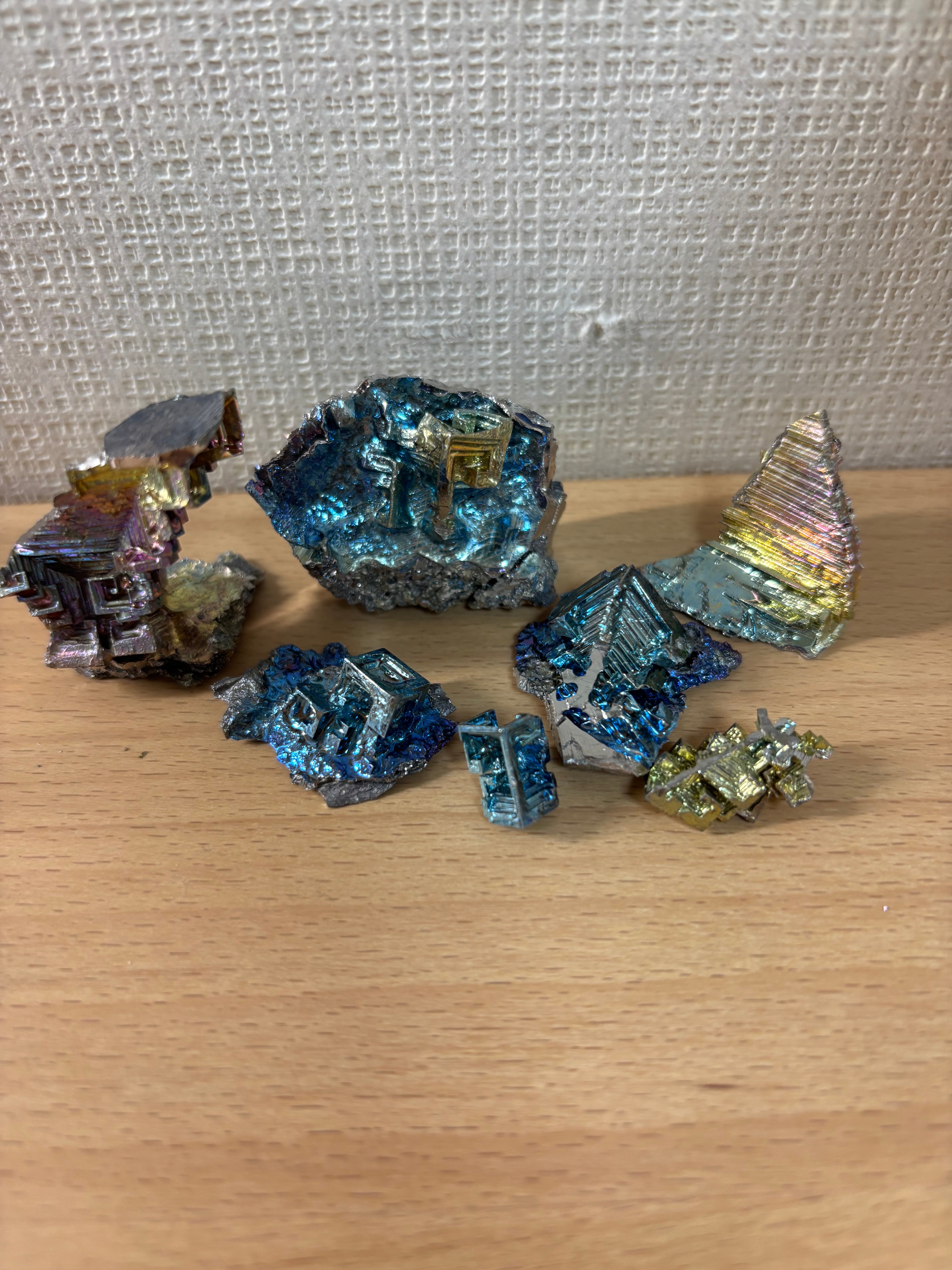 (下の写真は、リアルに科学部員である私が、部活のときに作ったビスマスの結晶です。きれいですよね。実際に見ると、もっときれいですよ。)