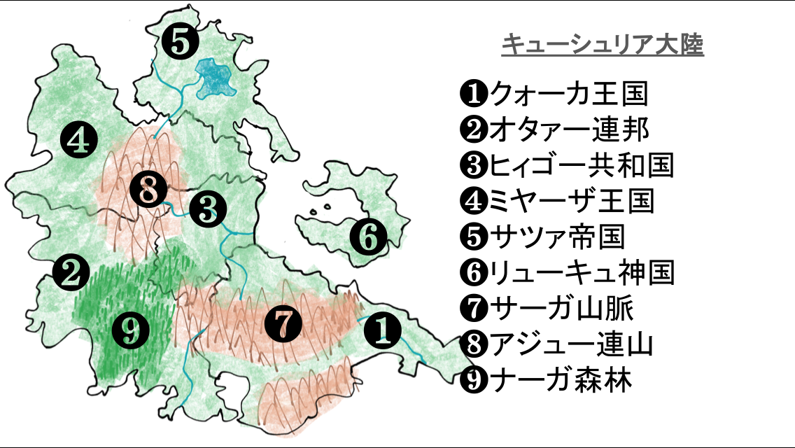 下のイラストは作者直筆の異世界の旅路の舞台の大陸の地図です!