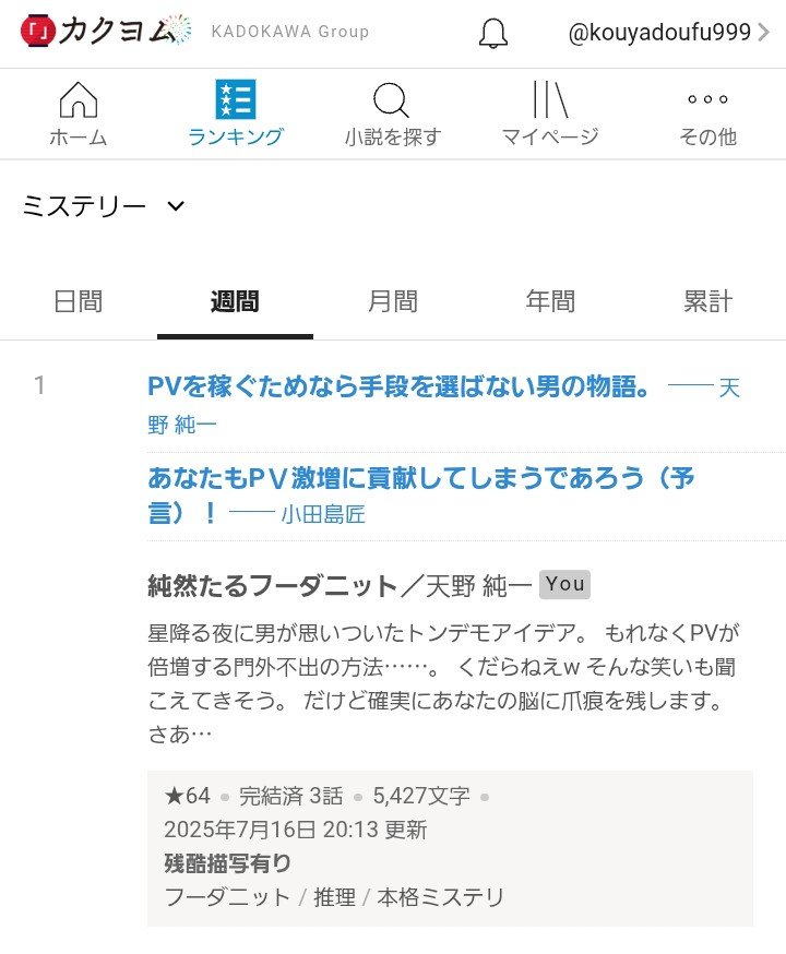 ついに、ついに、『純然たるフーダニット』にて初の週間ランキング第1位を達成しました!