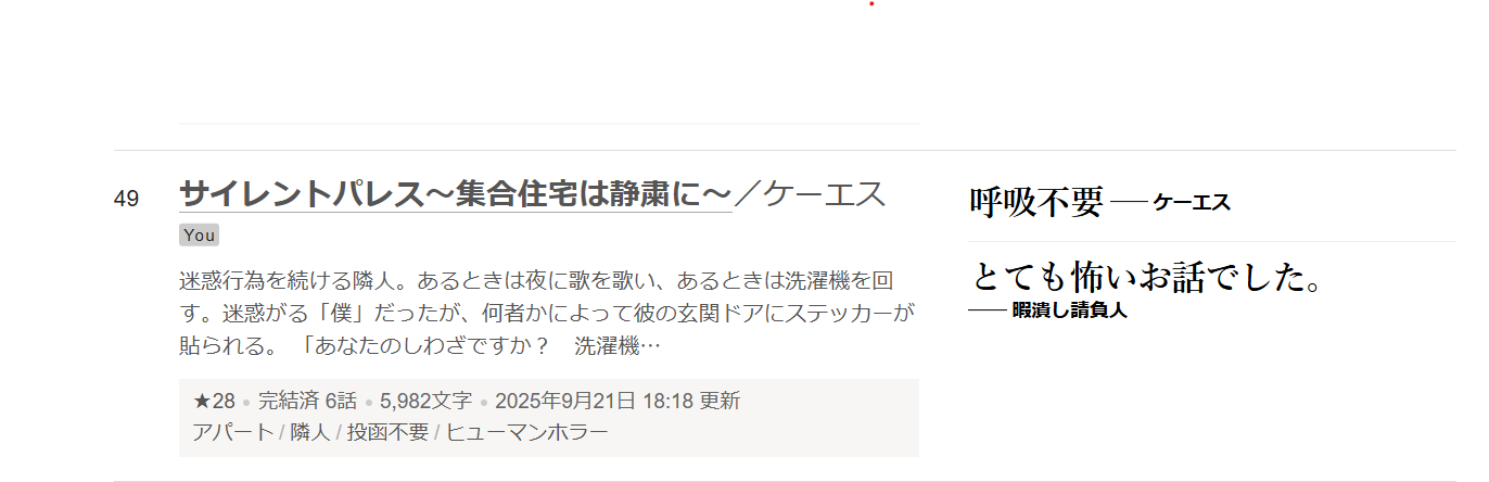 どうもケーエスです。『サイレントパレス~集合住宅は静粛に~』がホラー週間49位となりました! いわゆる完結ブーストがかかっておりまして、これもレビューを書いてくださったみなさんのおかげです、ありがとうございます!