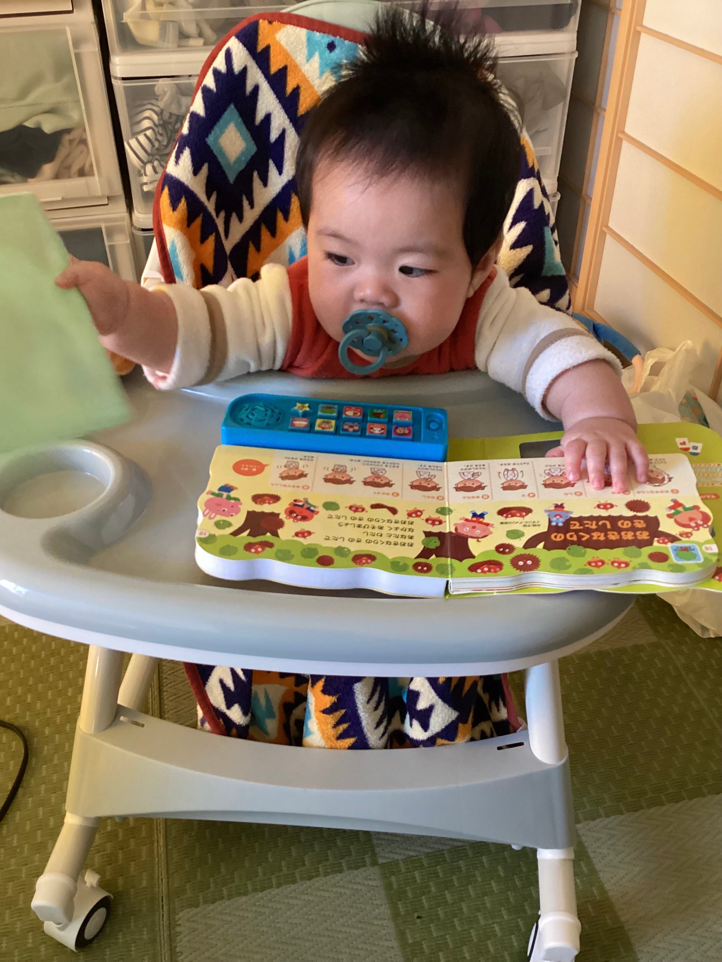 椅子に座らせて童謡の歌の本を聴かせてますが、暴れてバンバン叩くわ。