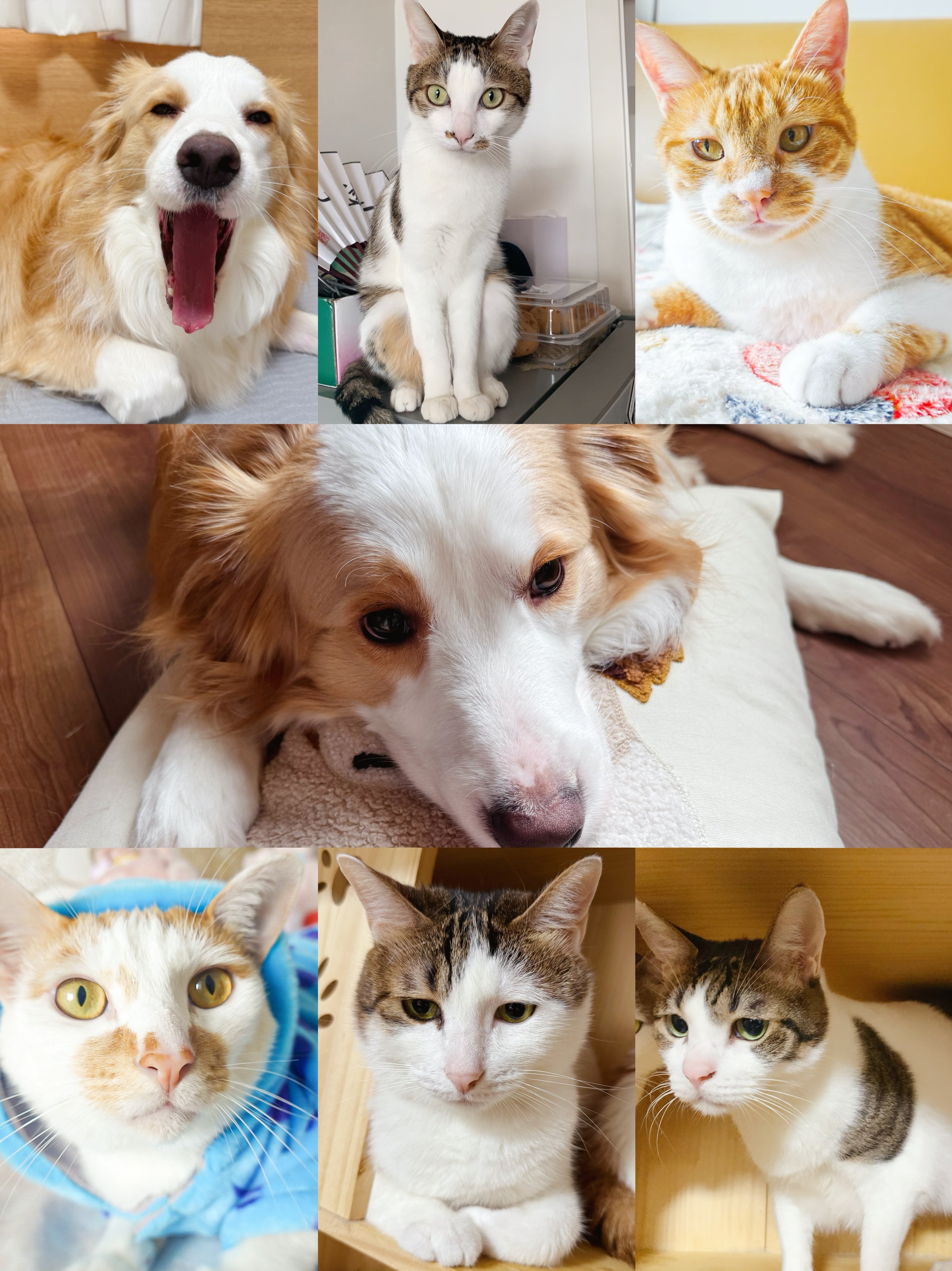 くり(元気いっぱいのボーダーコリー)、コメ(我が家で最初に迎えた猫)、ミカン(カメラ写り抜群な猫)