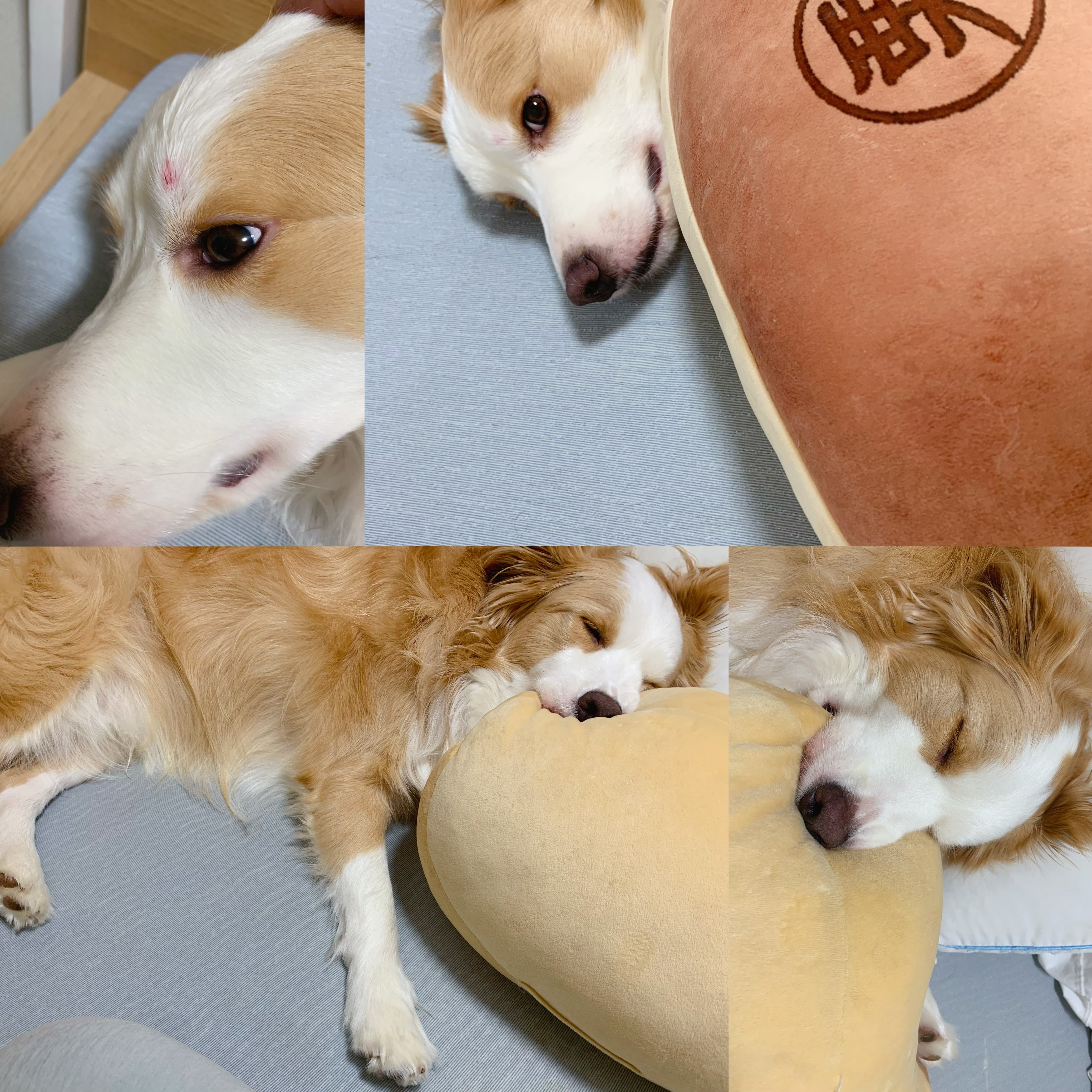 それから、なぜか寝るときはいろんなクッションを噛むのが好きで、本当にガブッと噛んでるんですよ。3枚目と4枚目をご覧ください〜
