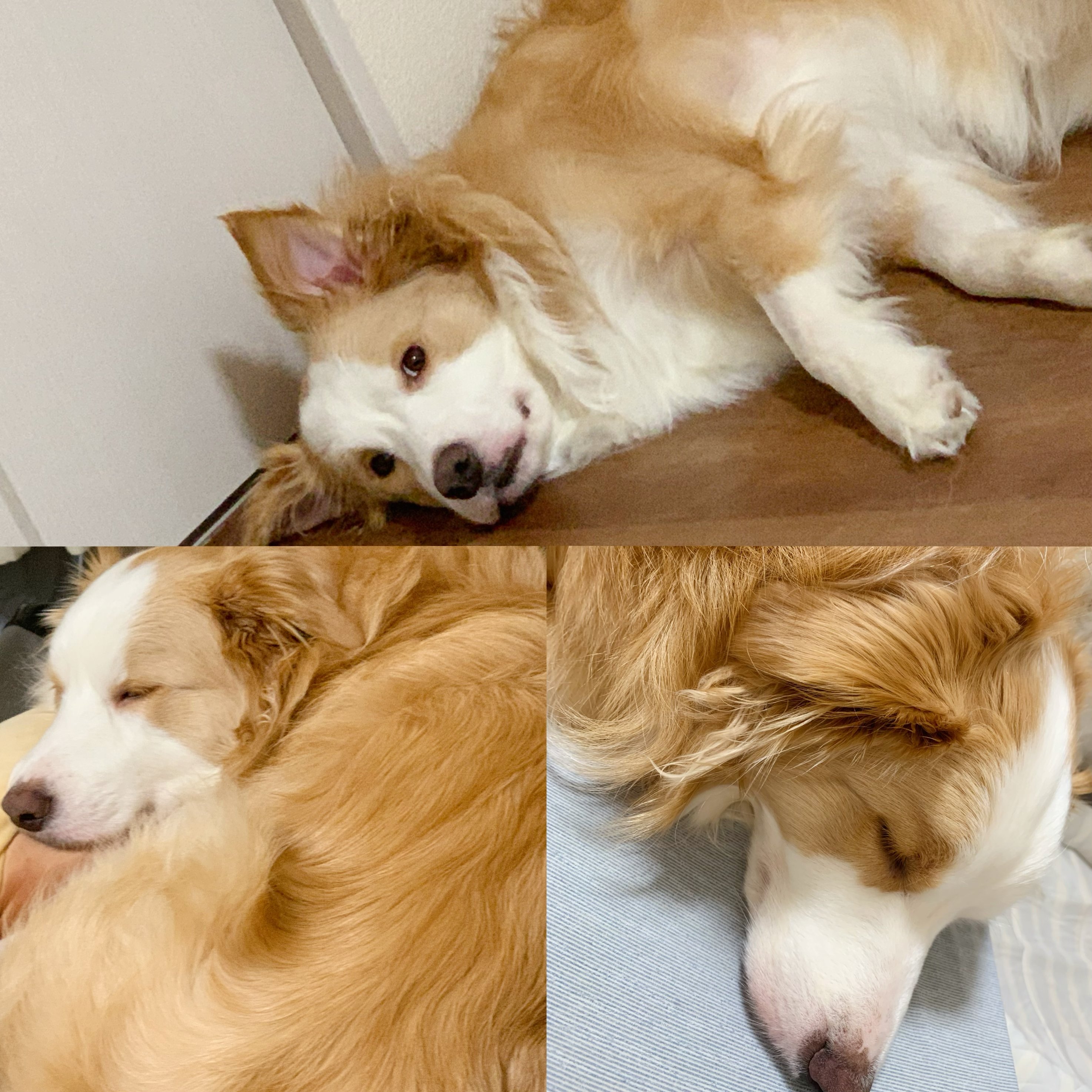最後に。写真は――「書かないと不安で眠れない私に付き合わされて眠れない愛犬」と、「執筆中は安心して熟睡する愛犬」です(笑)。