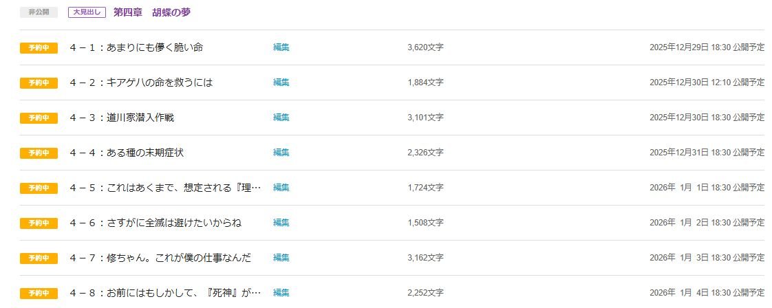 明日からは第四章『胡蝶の夢』を『全8話』(12/29~1/4日)にてお送りいたします。