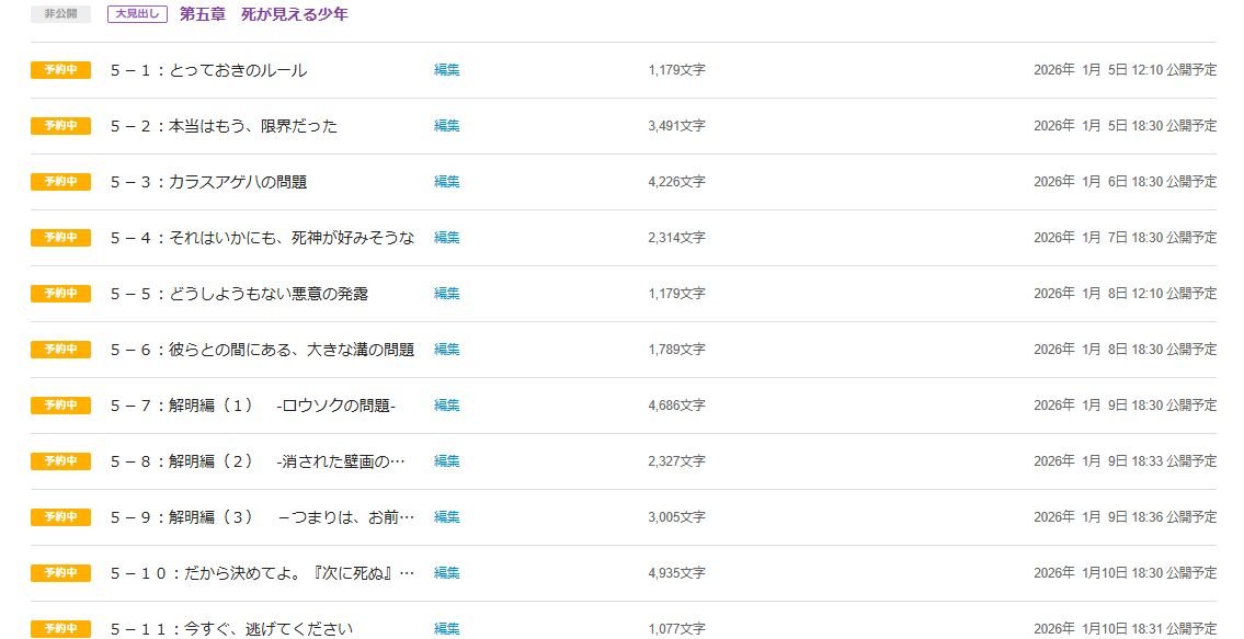 明日からは第五章『死が見える少年』を『全13話(+エピローグ)』(1月5日~1月11日)でお送りします。