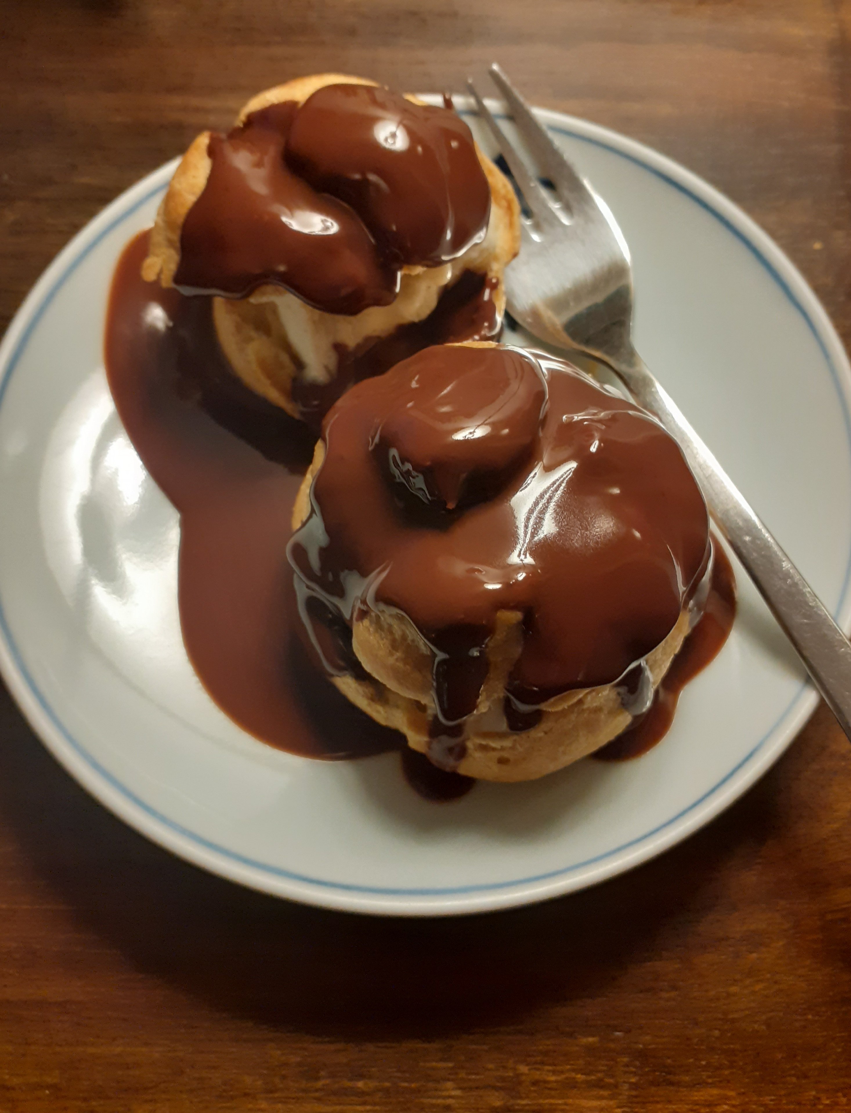 お目汚しの近況で申し訳ないので、以前リクエスト頂いた素人パティシエの作品を載せます。エッセイにも書きましたプロフィットロール (シューの中にバニラアイスを入れてチョコレートソースをかけたもの) です。